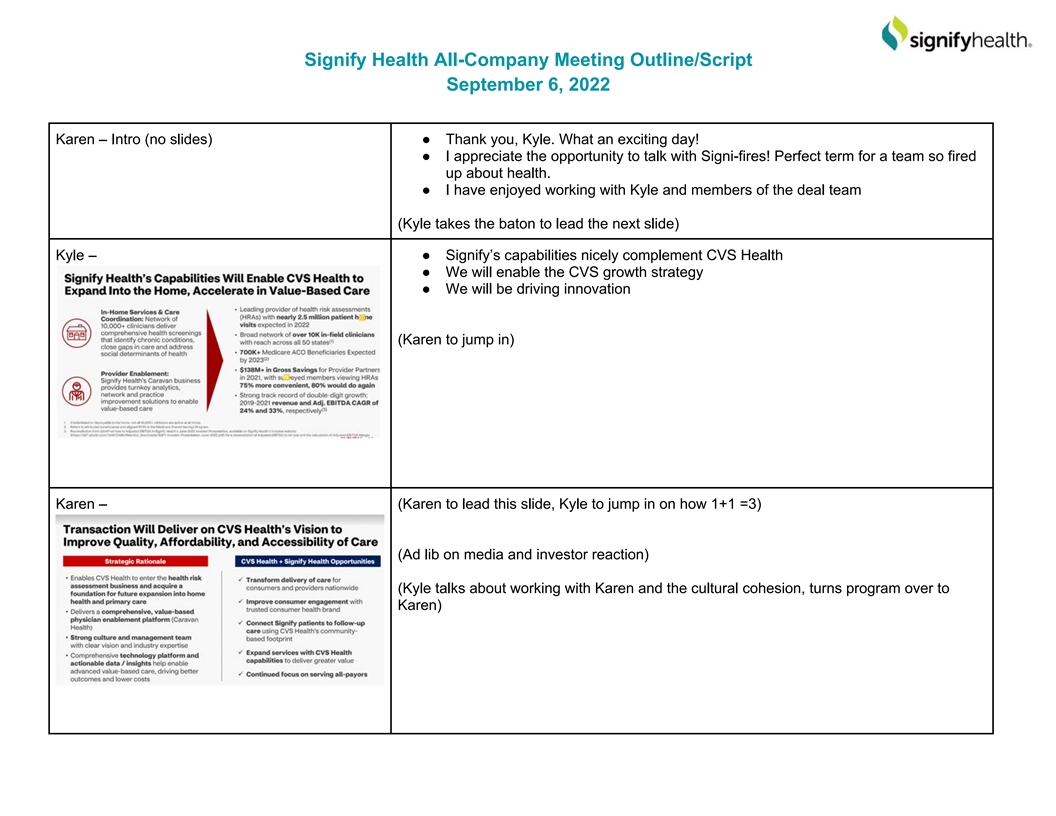 Signify Health All-Company Meeting Outline/Script September 6, 2022 Karen – Intro (no slides) ● Thank you, Kyle. What an exciting day! ● I appreciate the opportunity to talk with Signi-fires! Perfect term for a team so fired up about health. ● I have enjoyed working with Kyle and members of the deal team (Kyle takes the baton to lead the next slide) Kyle – ● Signify’s capabilities nicely complement CVS Health ● We will enable the CVS growth strategy ● We will be driving innovation (Karen to jump in) Karen – (Karen to lead this slide, Kyle to jump in on how 1+1 =3) (Ad lib on media and investor reaction) (Kyle talks about working with Karen and the cultural cohesion, turns program over to Karen)