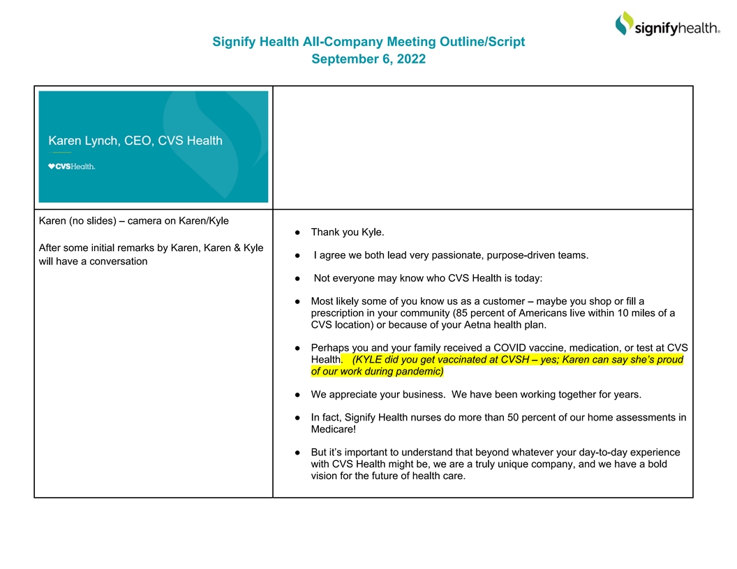 Signify Health All-Company Meeting Outline/Script September 6, 2022 Karen (no slides) – camera on Karen/Kyle ● Thank you Kyle. After some initial remarks by Karen, Karen & Kyle ● I agree we both lead very passionate, purpose-driven teams. will have a conversation ● Not everyone may know who CVS Health is today: ● Most likely some of you know us as a customer – maybe you shop or fill a prescription in your community (85 percent of Americans live within 10 miles of a CVS location) or because of your Aetna health plan. ● Perhaps you and your family received a COVID vaccine, medication, or test at CVS Health. (KYLE did you get vaccinated at CVSH – yes; Karen can say she’s proud of our work during pandemic) ● We appreciate your business. We have been working together for years. ● In fact, Signify Health nurses do more than 50 percent of our home assessments in Medicare! ● But it’s important to understand that beyond whatever your day-to-day experience with CVS Health might be, we are a truly unique company, and we have a bold vision for the future of health care.