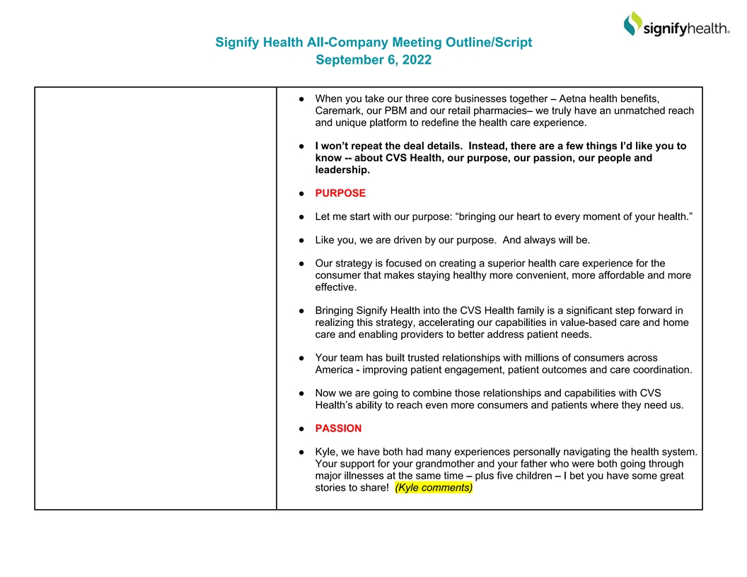 Signify Health All-Company Meeting Outline/Script September 6, 2022 ● When you take our three core businesses together – Aetna health benefits, Caremark, our PBM and our retail pharmacies– we truly have an unmatched reach and unique platform to redefine the health care experience. ● I won’t repeat the deal details. Instead, there are a few things I’d like you to know -- about CVS Health, our purpose, our passion, our people and leadership. ● PURPOSE ● Let me start with our purpose: “bringing our heart to every moment of your health.” ● Like you, we are driven by our purpose. And always will be. ● Our strategy is focused on creating a superior health care experience for the consumer that makes staying healthy more convenient, more affordable and more effective. ● Bringing Signify Health into the CVS Health family is a significant step forward in realizing this strategy, accelerating our capabilities in value-based care and home care and enabling providers to better address patient needs. ● Your team has built trusted relationships with millions of consumers across America - improving patient engagement, patient outcomes and care coordination. ● Now we are going to combine those relationships and capabilities with CVS Health’s ability to reach even more consumers and patients where they need us. ● PASSION ● Kyle, we have both had many experiences personally navigating the health system. Your support for your grandmother and your father who were both going through major illnesses at the same time – plus five children – I bet you have some great stories to share! (Kyle comments)