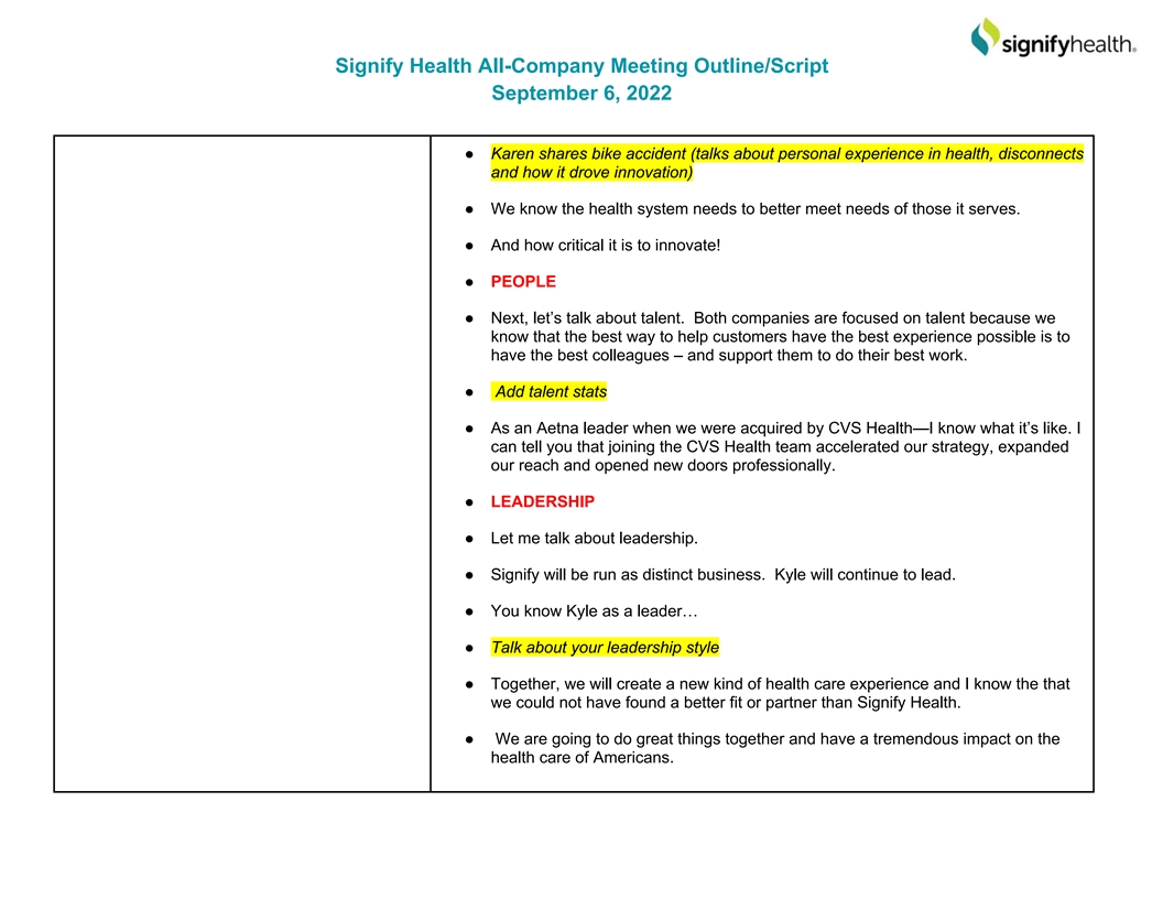 Signify Health All-Company Meeting Outline/Script September 6, 2022 ● Karen shares bike accident (talks about personal experience in health, disconnects and how it drove innovation) ● We know the health system needs to better meet needs of those it serves. ● And how critical it is to innovate! ● PEOPLE ● Next, let’s talk about talent. Both companies are focused on talent because we know that the best way to help customers have the best experience possible is to have the best colleagues – and support them to do their best work. ● Add talent stats ● As an Aetna leader when we were acquired by CVS Health—I know what it’s like. I can tell you that joining the CVS Health team accelerated our strategy, expanded our reach and opened new doors professionally. ● LEADERSHIP ● Let me talk about leadership. ● Signify will be run as distinct business. Kyle will continue to lead. ● You know Kyle as a leader… ● Talk about your leadership style ● Together, we will create a new kind of health care experience and I know the that we could not have found a better fit or partner than Signify Health. ● We are going to do great things together and have a tremendous impact on the health care of Americans.