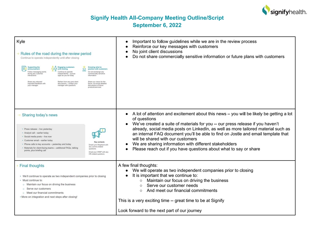 Signify Health All-Company Meeting Outline/Script September 6, 2022 Kyle ● Important to follow guidelines while we are in the review process ● Reinforce our key messages with customers ● No joint client discussions ● Do not share commercially sensitive information or future plans with customers ● A lot of attention and excitement about this news – you will be likely be getting a lot of questions ● We’ve created a suite of materials for you -- our press release if you haven’t already, social media posts on LinkedIn, as well as more tailored material such as an internal FAQ document you’ll be able to find on Jostle and email template that will be shared with our customers ● We are sharing information with different stakeholders ● Please reach out if you have questions about what to say or share A few final thoughts: ● We will operate as two independent companies prior to closing ● It is important that we continue to: ○ Maintain our focus on driving the business ○ Serve our customer needs ○ And meet our financial commitments This is a very exciting time -- great time to be at Signify Look forward to the next part of our journey