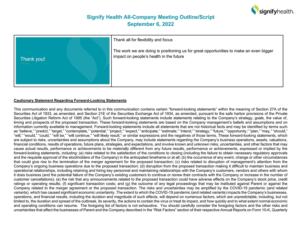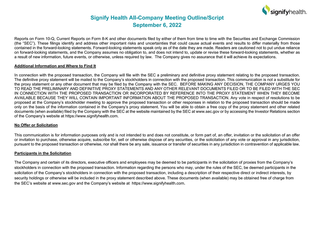 Signify Health All-Company Meeting Outline/Script September 6, 2022 Reports on Form 10-Q, Current Reports on Form 8-K and other documents filed by either of them from time to time with the Securities and Exchange Commission (the “SEC”). These filings identify and address other important risks and uncertainties that could cause actual events and results to differ materially from those contained in the forward-looking statements. Forward-looking statements speak only as of the date they are made. Readers are cautioned not to put undue reliance on forward-looking statements, and the Company assumes no obligation to, and does not intend to, update or revise these forward-looking statements, whether as a result of new information, future events, or otherwise, unless required by law. The Company gives no assurance that it will achieve its expectations. Additional Information and Where to Find It In connection with the proposed transaction, the Company will file with the SEC a preliminary and definitive proxy statement relating to the proposed transaction. The definitive proxy statement will be mailed to the Company’s stockholders in connection with the proposed transaction. This communication is not a substitute for the proxy statement or any other document that may be filed by the Company with the SEC. BEFORE MAKING ANY DECISION, THE COMPANY URGES YOU TO READ THE PRELIMINARY AND DEFINITIVE PROXY STATEMENTS AND ANY OTHER RELEVANT DOCUMENTS FILED OR TO BE FILED WITH THE SEC IN CONNECTION WITH THE PROPOSED TRANSACTION OR INCORPORATED BY REFERENCE INTO THE PROXY STATEMENT WHEN THEY BECOME AVAILABLE BECAUSE THEY WILL CONTAIN IMPORTANT INFORMATION ABOUT THE PROPOSED TRANSACTION. Any vote in respect of resolutions to be proposed at the Company’s stockholder meeting to approve the proposed transaction or other responses in relation to the proposed transaction should be made only on the basis of the information contained in the Company’s proxy statement. You will be able to obtain a free copy of the proxy statement and other related documents (when available) filed by the Company with the SEC at the website maintained by the SEC at www.sec.gov or by accessing the Investor Relations section of the Company’s website at https://www.signifyhealth.com. No Offer or Solicitation This communication is for information purposes only and is not intended to and does not constitute, or form part of, an offer, invitation or the solicitation of an offer or invitation to purchase, otherwise acquire, subscribe for, sell or otherwise dispose of any securities, or the solicitation of any vote or approval in any jurisdiction, pursuant to the proposed transaction or otherwise, nor shall there be any sale, issuance or transfer of securities in any jurisdiction in contravention of applicable law. Participants in the Solicitation The Company and certain of its directors, executive officers and employees may be deemed to be participants in the solicitation of proxies from the Company’s stockholders in connection with the proposed transaction. Information regarding the persons who may, under the rules of the SEC, be deemed participants in the solicitation of the Company’s stockholders in connection with the proposed transaction, including a description of their respective direct or indirect interests, by security holdings or otherwise will be included in the proxy statement described above. These documents (when available) may be obtained free of charge from the SEC’s website at www.sec.gov and the Company’s website at https://www.signifyhealth.com.