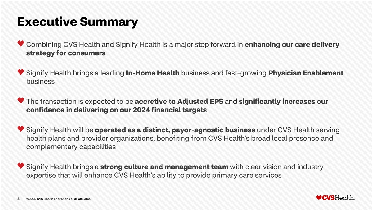 Key Transaction Terms • Acquiring 100% of Signify Health for a purchase consideration of $30.50 per share in cash Purchase Price • Equity value of $7.6 billion. Accounting for Signify net debt, equity appreciation rights and estimated fees and expenses, total transaction value of approx. $8 billion • Following the transaction close, Signify Health CEO Kyle Armbrester will continue to Management & lead Signify Health as part of CVS Health Organizational Structure • Signify Health will operate as a distinct, payor-agnostic business within CVS Health, led by members of Signify Health’s current management team • Transaction expected to close in the first half of 2023 Closing • Subject to regulatory approvals and other customary closing considerations 3 3 3 ©2 ©20 02 22 2 C CV VS S H He ea al lt th h a an nd d/ /o or r o on ne e o of i f it ts s a affi ffil li ia at te es s. .