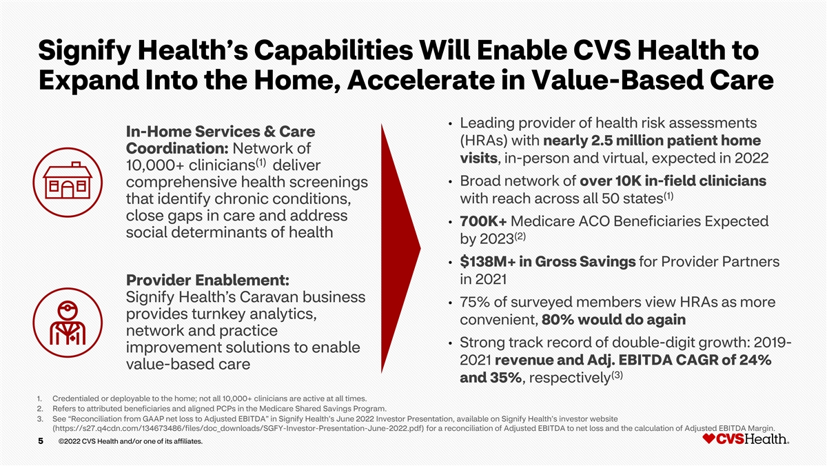 Signify Health’s Capabilities Will Enable CVS Health to Expand Into the Home, Accelerate in Value-Based Care • Leading provider of health risk assessments (HRAs) In-Home Services & Care with nearly 2.5 million patient home visits,in- Coordination: Network of 10,000+ person and virtual, expected in 2022 (1) clinicians deliver comprehensive • Broad network of over 10K in-field clinicians health screenings that identify (1) with reach across all 50 states chronic conditions, close gaps in care and address social • 700K+ Medicare ACO Beneficiaries Expected by determinants of health (2) 2023 • $138M+ in Gross Savings for Provider Partners in 2021 Provider Enablement: • 75% of surveyed members view HRAs as more Signify Health’s Caravan business convenient, 80% would do again provides turnkey analytics, network and practice improvement solutions • Strong track record of double-digit growth: 2019- to enable value-based care 2021 revenue and Adj. EBITDA CAGR of 24% (3) and 35%, respectively 1. Credentialed or deployable to the home; not all 10,000+ clinicians are active at all times. 2. Refers to attributed beneficiaries and aligned PCPs in the Medicare Shared Savings Program. 3. See “Reconciliation from GAAP net loss to Adjusted EBITDA” in Signify Health’s June 2022 Investor Presentation, available on Signify Health’s investor website (https://s27.q4cdn.com/134673486/files/doc_downloads/SGFY-Investor-Presentation-June-2022.pdf) for a reconciliation of Adjusted EBITDA to net loss and the calculation of Adjusted EBITDA Margin. 4 ©2022 CVS Health and/or one of its affiliates.