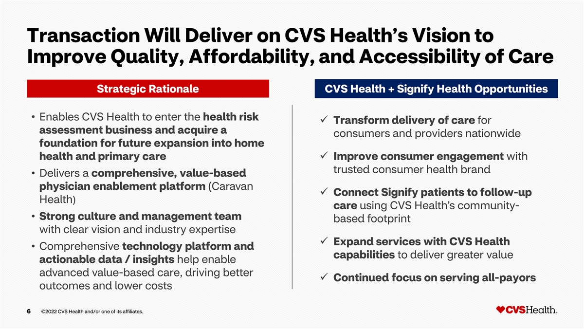 Transaction Will Deliver on CVS Health’s Vision to Improve Quality, Affordability, and Accessibility of Care Strategic Rationale CVS Health + Signify Health Opportunities • Enables CVS Health to enter the health risk ✔ Transform delivery of care for consumers assessment business and acquire a and providers nationwide foundation for future expansion into home health and primary care✔ Improve consumer engagement with trusted consumer health brand • Delivers a comprehensive, value-based physician enablement platform (Caravan ✔ Connect Signify patients to follow-up Health) care using CVS Health’s community-based • Strong culture and management team with footprint clear vision and industry expertise ✔ Expand services with CVS Health • Comprehensive technology platform and capabilities to deliver greater value actionable data / insights help enable advanced value-based care, driving better ✔ Continued focus on serving all-payors outcomes and lower costs 5 ©2022 CVS Health and/or one of its affiliates.