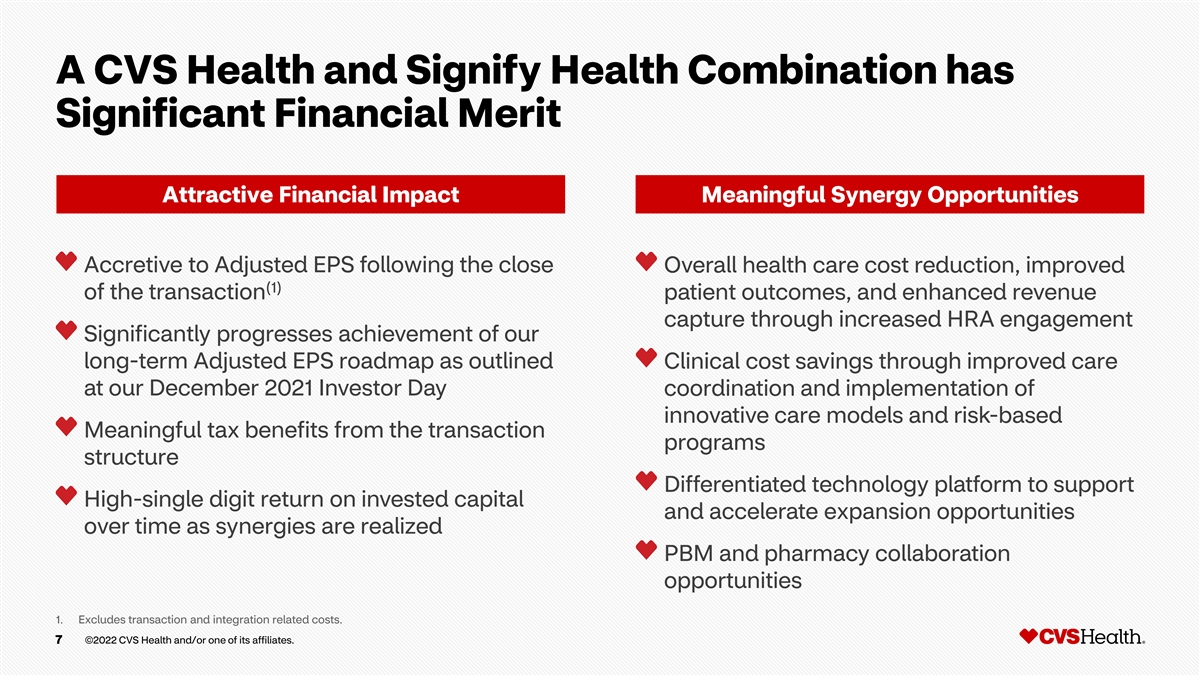 Transaction Will Deliver on CVS Health’s Vision to Improve Quality, Affordability, and Accessibility of Care Strategic Rationale CVS Health + Signify Health Opportunities • Enables CVS Health to enter the health risk ü Transform delivery of care for assessment business and acquire a consumers and providers nationwide foundation for future expansion into home health and primary careü Improve consumer engagement with trusted consumer health brand • Delivers a comprehensive, value-based physician enablement platform (Caravan ü Connect Signify patients to follow-up Health ) care using CVS Health’s community- • Strong culture and management team based footprint with clear vision and industry expertise ü Expand services with CVS Health • Comprehensive technology platform and capabilities to deliver greater value actionable data / insights help enable advanced value-based care, driving better ü Continued focus on serving all-payors outcomes and lower costs 6 ©2022 CVS Health and/or one of its affiliates.