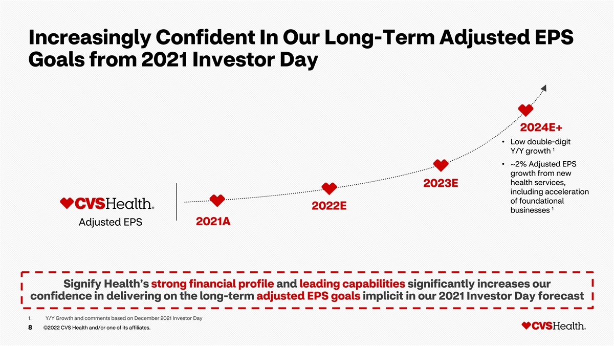 A CVS Health and Signify Health Combination has Significant Financial Merit Attractive Financial Impact Meaningful Synergy Opportunities Accretive to Adjusted EPS following the close Overall health care cost reduction, improved (1) of the transaction patient outcomes, and enhanced revenue capture through increased HRA engagement Significantly progresses achievement of our long-term Adjusted EPS roadmap as outlined Clinical cost savings through improved care at our December 2021 Investor Day coordination and implementation of innovative care models and risk-based Meaningful tax benefits from the transaction programs structure Differentiated technology platform to support High-single digit return on invested capital and accelerate expansion opportunities over time as synergies are realized PBM and pharmacy collaboration opportunities 1. Excludes transaction and integration related costs. 7 7 ©2022 CVS Health and/or one of its affiliates.