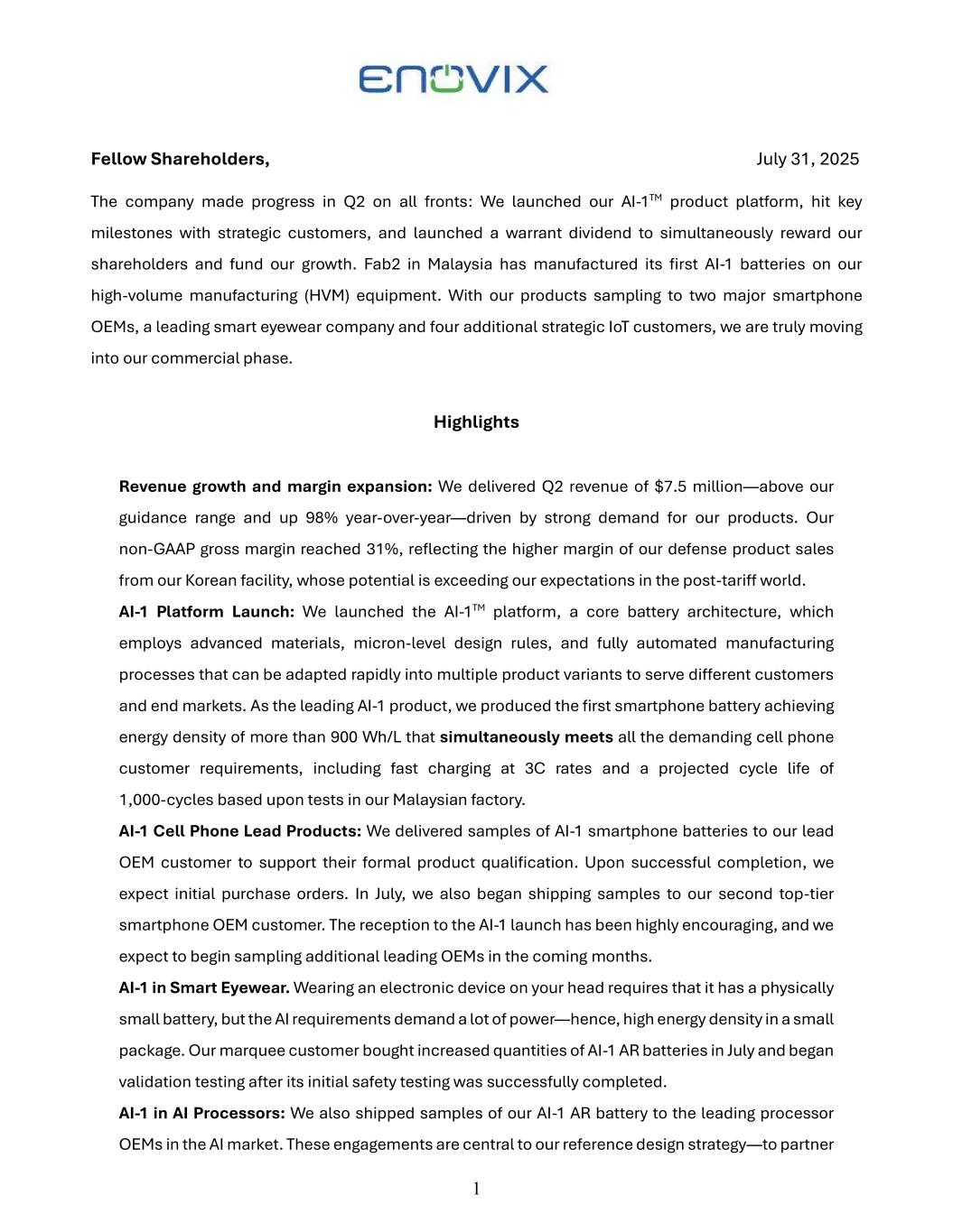 1 Fellow Shareholders, July 31, 2025 The company made progress in Q2 on all fronts: We launched our AI-1TM product platform, hit key milestones with strategic customers, and launched a warrant dividend to simultaneously reward our shareholders and fund our growth. Fab2 in Malaysia has manufactured its first AI-1 batteries on our high-volume manufacturing (HVM) equipment. With our products sampling to two major smartphone OEMs, a leading smart eyewear company and four additional strategic IoT customers, we are truly moving into our commercial phase. Highlights Revenue growth and margin expansion: We delivered Q2 revenue of $7.5 million—above our guidance range and up 98% year-over-year—driven by strong demand for our products. Our non-GAAP gross margin reached 31%, reflecting the higher margin of our defense product sales from our Korean facility, whose potential is exceeding our expectations in the post-tariff world. AI-1 Platform Launch: We launched the AI-1TM platform, a core battery architecture, which employs advanced materials, micron-level design rules, and fully automated manufacturing processes that can be adapted rapidly into multiple product variants to serve different customers and end markets. As the leading AI-1 product, we produced the first smartphone battery achieving energy density of more than 900 Wh/L that simultaneously meets all the demanding cell phone customer requirements, including fast charging at 3C rates and a projected cycle life of 1,000-cycles based upon tests in our Malaysian factory. AI-1 Cell Phone Lead Products: We delivered samples of AI-1 smartphone batteries to our lead OEM customer to support their formal product qualification. Upon successful completion, we expect initial purchase orders. In July, we also began shipping samples to our second top-tier smartphone OEM customer. The reception to the AI-1 launch has been highly encouraging, and we expect to begin sampling additional leading OEMs in the coming months. AI-1 in Smart Eyewear. Wearing an electronic device on your head requires that it has a physically small battery, but the AI requirements demand a lot of power—hence, high energy density in a small package. Our marquee customer bought increased quantities of AI-1 AR batteries in July and began validation testing after its initial safety testing was successfully completed. AI-1 in AI Processors: We also shipped samples of our AI-1 AR battery to the leading processor OEMs in the AI market. These engagements are central to our reference design strategy—to partner