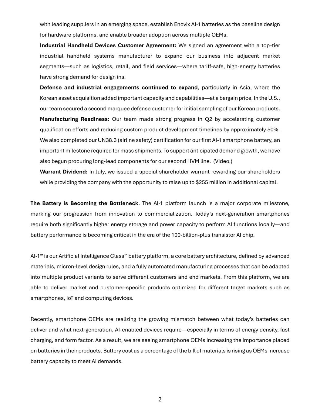 2 with leading suppliers in an emerging space, establish Enovix AI-1 batteries as the baseline design for hardware platforms, and enable broader adoption across multiple OEMs. Industrial Handheld Devices Customer Agreement: We signed an agreement with a top-tier industrial handheld systems manufacturer to expand our business into adjacent market segments—such as logistics, retail, and field services—where tariff-safe, high-energy batteries have strong demand for design ins. Defense and industrial engagements continued to expand, particularly in Asia, where the Korean asset acquisition added important capacity and capabilities—at a bargain price. In the U.S., our team secured a second marquee defense customer for initial sampling of our Korean products. Manufacturing Readiness: Our team made strong progress in Q2 by accelerating customer qualification efforts and reducing custom product development timelines by approximately 50%. We also completed our UN38.3 (airline safety) certification for our first AI-1 smartphone battery, an important milestone required for mass shipments. To support anticipated demand growth, we have also begun procuring long-lead components for our second HVM line. (Video.) Warrant Dividend: In July, we issued a special shareholder warrant rewarding our shareholders while providing the company with the opportunity to raise up to $255 million in additional capital. The Battery is Becoming the Bottleneck. The AI-1 platform launch is a major corporate milestone, marking our progression from innovation to commercialization. Today’s next-generation smartphones require both significantly higher energy storage and power capacity to perform AI functions locally—and battery performance is becoming critical in the era of the 100-billion-plus transistor AI chip. AI-1™ is our Artificial Intelligence Class™ battery platform, a core battery architecture, defined by advanced materials, micron-level design rules, and a fully automated manufacturing processes that can be adapted into multiple product variants to serve different customers and end markets. From this platform, we are able to deliver market and customer-specific products optimized for different target markets such as smartphones, IoT and computing devices. Recently, smartphone OEMs are realizing the growing mismatch between what today’s batteries can deliver and what next-generation, AI-enabled devices require—especially in terms of energy density, fast charging, and form factor. As a result, we are seeing smartphone OEMs increasing the importance placed on batteries in their products. Battery cost as a percentage of the bill of materials is rising as OEMs increase battery capacity to meet AI demands.
