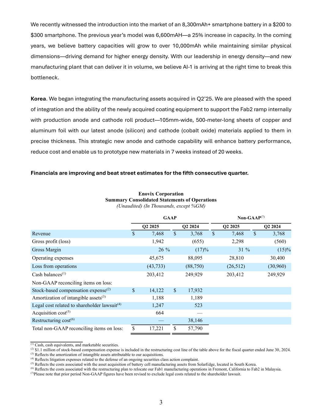 3 We recently witnessed the introduction into the market of an 8,300mAh+ smartphone battery in a $200 to $300 smartphone. The previous year’s model was 6,600mAH—a 25% increase in capacity. In the coming years, we believe battery capacities will grow to over 10,000mAh while maintaining similar physical dimensions—driving demand for higher energy density. With our leadership in energy density—and new manufacturing plant that can deliver it in volume, we believe AI-1 is arriving at the right time to break this bottleneck. Korea. We began integrating the manufacturing assets acquired in Q2’25. We are pleased with the speed of integration and the ability of the newly acquired coating equipment to support the Fab2 ramp internally with production anode and cathode roll product—105mm-wide, 500-meter-long sheets of copper and aluminum foil with our latest anode (silicon) and cathode (cobalt oxide) materials applied to them in precise thickness. This strategic new anode and cathode capability will enhance battery performance, reduce cost and enable us to prototype new materials in 7 weeks instead of 20 weeks. Financials are improving and beat street estimates for the fifth consecutive quarter. Enovix Corporation Summary Consolidated Statements of Operations (Unaudited) (In Thousands, except %GM) GAAP Non-GAAP(7) Q2 2025 Q2 2024 Q2 2025 Q2 2024 Revenue $ 7,468 $ 3,768 $ 7,468 $ 3,768 Gross profit (loss) 1,942 (655) 2,298 (560) Gross Margin 26 % (17) % 31 % (15) % Operating expenses 45,675 88,095 28,810 30,400 Loss from operations (43,733) (88,750) (26,512) (30,960) Cash balances(1) 203,412 249,929 203,412 249,929 Non-GAAP reconciling items on loss: Stock-based compensation expense(2) $ 14,122 $ 17,932 Amortization of intangible assets(3) 1,188 1,189 Legal cost related to shareholder lawsuit(4) 1,247 523 Acquisition cost(5) 664 — Restructuring cost(6) — 38,146 Total non-GAAP reconciling items on loss: $ 17,221 $ 57,790 (1) Cash, cash equivalents, and marketable securities. (2) $1.1 million of stock-based compensation expense is included in the restructuring cost line of the table above for the fiscal quarter ended June 30, 2024. (3) Reflects the amortization of intangible assets attributable to our acquisitions. (4) Reflects litigation expenses related to the defense of an ongoing securities class action complaint. (5) Reflects the costs associated with the asset acquisition of battery cell manufacturing assets from SolarEdge, located in South Korea. (6) Reflects the costs associated with the restructuring plan to relocate our Fab1 manufacturing operations in Fremont, California to Fab2 in Malaysia. (7)Please note that prior period Non-GAAP figures have been revised to exclude legal costs related to the shareholder lawsuit.