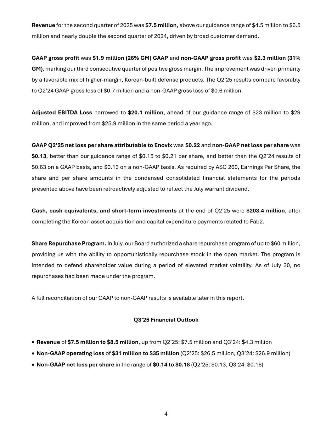 4 Revenue for the second quarter of 2025 was $7.5 million, above our guidance range of $4.5 million to $6.5 million and nearly double the second quarter of 2024, driven by broad customer demand. GAAP gross profit was $1.9 million (26% GM) GAAP and non-GAAP gross profit was $2.3 million (31% GM), marking our third consecutive quarter of positive gross margin. The improvement was driven primarily by a favorable mix of higher-margin, Korean-built defense products. The Q2’25 results compare favorably to Q2’24 GAAP gross loss of $0.7 million and a non-GAAP gross loss of $0.6 million. Adjusted EBITDA Loss narrowed to $20.1 million, ahead of our guidance range of $23 million to $29 million, and improved from $25.9 million in the same period a year ago. GAAP Q2’25 net loss per share attributable to Enovix was $0.22 and non-GAAP net loss per share was $0.13, better than our guidance range of $0.15 to $0.21 per share, and better than the Q2’24 results of $0.63 on a GAAP basis, and $0.13 on a non-GAAP basis. As required by ASC 260, Earnings Per Share, the share and per share amounts in the condensed consolidated financial statements for the periods presented above have been retroactively adjusted to reflect the July warrant dividend. Cash, cash equivalents, and short-term investments at the end of Q2’25 were $203.4 million, after completing the Korean asset acquisition and capital expenditure payments related to Fab2. Share Repurchase Program. In July, our Board authorized a share repurchase program of up to $60 million, providing us with the ability to opportunistically repurchase stock in the open market. The program is intended to defend shareholder value during a period of elevated market volatility. As of July 30, no repurchases had been made under the program. A full reconciliation of our GAAP to non-GAAP results is available later in this report. Q3’25 Financial Outlook • Revenue of $7.5 million to $8.5 million, up from Q2’25: $7.5 million and Q3’24: $4.3 million • Non-GAAP operating loss of $31 million to $35 million (Q2’25: $26.5 million, Q3’24: $26.9 million) • Non-GAAP net loss per share in the range of $0.14 to $0.18 (Q2’25: $0.13, Q3’24: $0.16)