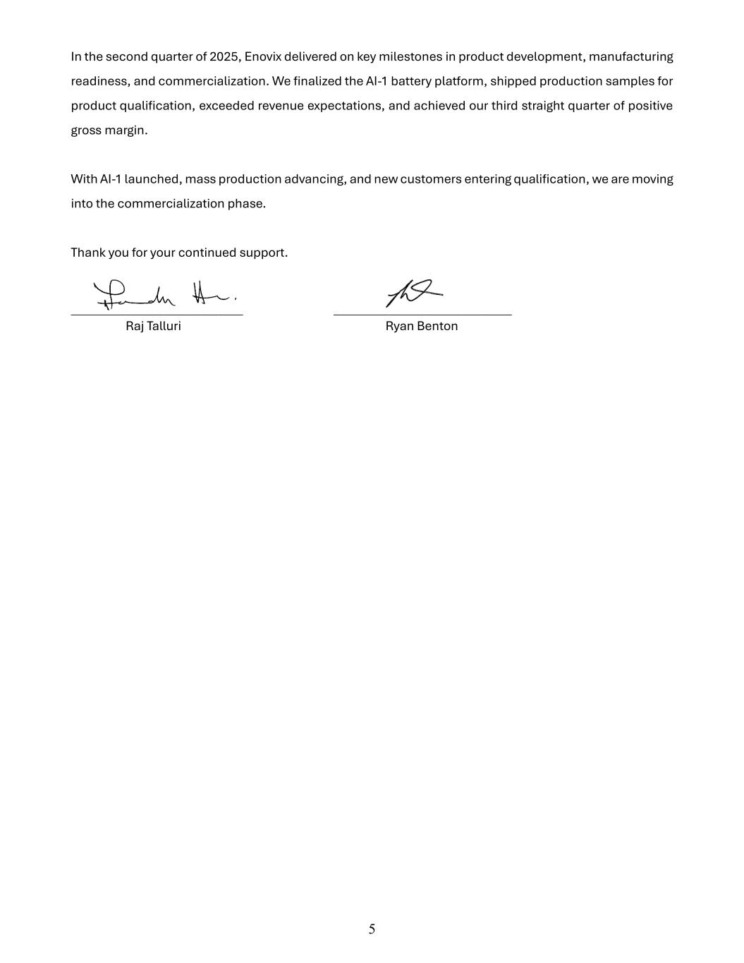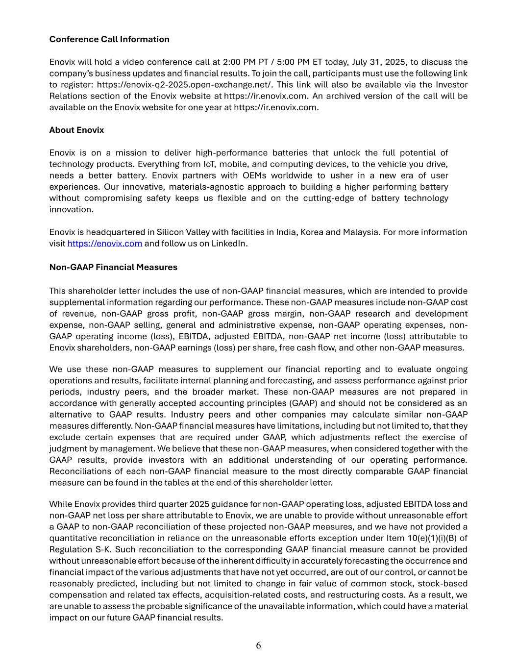 6 Conference Call Information Enovix will hold a video conference call at 2:00 PM PT / 5:00 PM ET today, July 31, 2025, to discuss the company’s business updates and financial results. To join the call, participants must use the following link to register: https://enovix-q2-2025.open-exchange.net/. This link will also be available via the Investor Relations section of the Enovix website at https://ir.enovix.com. An archived version of the call will be available on the Enovix website for one year at https://ir.enovix.com. About Enovix Enovix is on a mission to deliver high-performance batteries that unlock the full potential of technology products. Everything from IoT, mobile, and computing devices, to the vehicle you drive, needs a better battery. Enovix partners with OEMs worldwide to usher in a new era of user experiences. Our innovative, materials-agnostic approach to building a higher performing battery without compromising safety keeps us flexible and on the cutting-edge of battery technology innovation. Enovix is headquartered in Silicon Valley with facilities in India, Korea and Malaysia. For more information visit https://enovix.com and follow us on LinkedIn. Non-GAAP Financial Measures This shareholder letter includes the use of non-GAAP financial measures, which are intended to provide supplemental information regarding our performance. These non-GAAP measures include non-GAAP cost of revenue, non-GAAP gross profit, non-GAAP gross margin, non-GAAP research and development expense, non-GAAP selling, general and administrative expense, non-GAAP operating expenses, non- GAAP operating income (loss), EBITDA, adjusted EBITDA, non-GAAP net income (loss) attributable to Enovix shareholders, non-GAAP earnings (loss) per share, free cash flow, and other non-GAAP measures. We use these non-GAAP measures to supplement our financial reporting and to evaluate ongoing operations and results, facilitate internal planning and forecasting, and assess performance against prior periods, industry peers, and the broader market. These non-GAAP measures are not prepared in accordance with generally accepted accounting principles (GAAP) and should not be considered as an alternative to GAAP results. Industry peers and other companies may calculate similar non-GAAP measures differently. Non-GAAP financial measures have limitations, including but not limited to, that they exclude certain expenses that are required under GAAP, which adjustments reflect the exercise of judgment by management. We believe that these non-GAAP measures, when considered together with the GAAP results, provide investors with an additional understanding of our operating performance. Reconciliations of each non-GAAP financial measure to the most directly comparable GAAP financial measure can be found in the tables at the end of this shareholder letter. While Enovix provides third quarter 2025 guidance for non-GAAP operating loss, adjusted EBITDA loss and non-GAAP net loss per share attributable to Enovix, we are unable to provide without unreasonable effort a GAAP to non-GAAP reconciliation of these projected non-GAAP measures, and we have not provided a quantitative reconciliation in reliance on the unreasonable efforts exception under Item 10(e)(1)(i)(B) of Regulation S-K. Such reconciliation to the corresponding GAAP financial measure cannot be provided without unreasonable effort because of the inherent difficulty in accurately forecasting the occurrence and financial impact of the various adjustments that have not yet occurred, are out of our control, or cannot be reasonably predicted, including but not limited to change in fair value of common stock, stock-based compensation and related tax effects, acquisition-related costs, and restructuring costs. As a result, we are unable to assess the probable significance of the unavailable information, which could have a material impact on our future GAAP financial results.