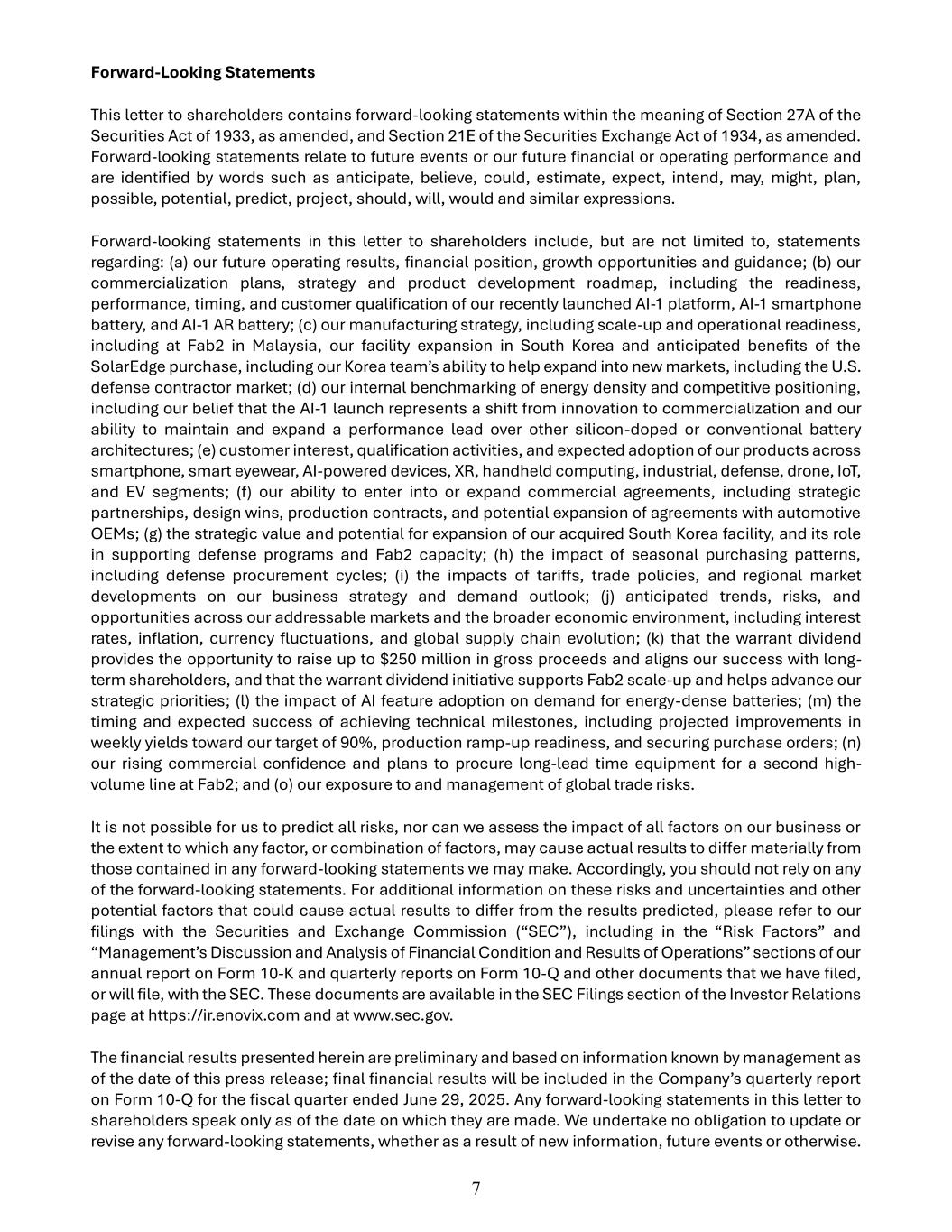 7 Forward-Looking Statements This letter to shareholders contains forward-looking statements within the meaning of Section 27A of the Securities Act of 1933, as amended, and Section 21E of the Securities Exchange Act of 1934, as amended. Forward-looking statements relate to future events or our future financial or operating performance and are identified by words such as anticipate, believe, could, estimate, expect, intend, may, might, plan, possible, potential, predict, project, should, will, would and similar expressions. Forward-looking statements in this letter to shareholders include, but are not limited to, statements regarding: (a) our future operating results, financial position, growth opportunities and guidance; (b) our commercialization plans, strategy and product development roadmap, including the readiness, performance, timing, and customer qualification of our recently launched AI-1 platform, AI-1 smartphone battery, and AI-1 AR battery; (c) our manufacturing strategy, including scale-up and operational readiness, including at Fab2 in Malaysia, our facility expansion in South Korea and anticipated benefits of the SolarEdge purchase, including our Korea team’s ability to help expand into new markets, including the U.S. defense contractor market; (d) our internal benchmarking of energy density and competitive positioning, including our belief that the AI-1 launch represents a shift from innovation to commercialization and our ability to maintain and expand a performance lead over other silicon-doped or conventional battery architectures; (e) customer interest, qualification activities, and expected adoption of our products across smartphone, smart eyewear, AI-powered devices, XR, handheld computing, industrial, defense, drone, IoT, and EV segments; (f) our ability to enter into or expand commercial agreements, including strategic partnerships, design wins, production contracts, and potential expansion of agreements with automotive OEMs; (g) the strategic value and potential for expansion of our acquired South Korea facility, and its role in supporting defense programs and Fab2 capacity; (h) the impact of seasonal purchasing patterns, including defense procurement cycles; (i) the impacts of tariffs, trade policies, and regional market developments on our business strategy and demand outlook; (j) anticipated trends, risks, and opportunities across our addressable markets and the broader economic environment, including interest rates, inflation, currency fluctuations, and global supply chain evolution; (k) that the warrant dividend provides the opportunity to raise up to $250 million in gross proceeds and aligns our success with long- term shareholders, and that the warrant dividend initiative supports Fab2 scale-up and helps advance our strategic priorities; (l) the impact of AI feature adoption on demand for energy-dense batteries; (m) the timing and expected success of achieving technical milestones, including projected improvements in weekly yields toward our target of 90%, production ramp-up readiness, and securing purchase orders; (n) our rising commercial confidence and plans to procure long-lead time equipment for a second high- volume line at Fab2; and (o) our exposure to and management of global trade risks. It is not possible for us to predict all risks, nor can we assess the impact of all factors on our business or the extent to which any factor, or combination of factors, may cause actual results to differ materially from those contained in any forward-looking statements we may make. Accordingly, you should not rely on any of the forward-looking statements. For additional information on these risks and uncertainties and other potential factors that could cause actual results to differ from the results predicted, please refer to our filings with the Securities and Exchange Commission (“SEC”), including in the “Risk Factors” and “Management’s Discussion and Analysis of Financial Condition and Results of Operations” sections of our annual report on Form 10-K and quarterly reports on Form 10-Q and other documents that we have filed, or will file, with the SEC. These documents are available in the SEC Filings section of the Investor Relations page at https://ir.enovix.com and at www.sec.gov. The financial results presented herein are preliminary and based on information known by management as of the date of this press release; final financial results will be included in the Company’s quarterly report on Form 10-Q for the fiscal quarter ended June 29, 2025. Any forward-looking statements in this letter to shareholders speak only as of the date on which they are made. We undertake no obligation to update or revise any forward-looking statements, whether as a result of new information, future events or otherwise.