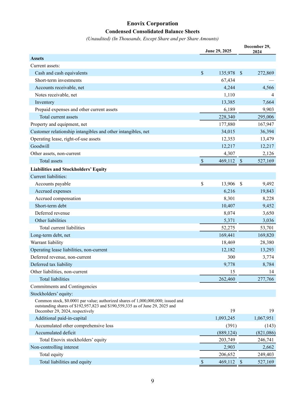 9 Enovix Corporation Condensed Consolidated Balance Sheets (Unaudited) (In Thousands, Except Share and per Share Amounts) June 29, 2025 December 29, 2024 Assets Current assets: Cash and cash equivalents $ 135,978 $ 272,869 Short-term investments 67,434 — Accounts receivable, net 4,244 4,566 Notes receivable, net 1,110 4 Inventory 13,385 7,664 Prepaid expenses and other current assets 6,189 9,903 Total current assets 228,340 295,006 Property and equipment, net 177,880 167,947 Customer relationship intangibles and other intangibles, net 34,015 36,394 Operating lease, right-of-use assets 12,353 13,479 Goodwill 12,217 12,217 Other assets, non-current 4,307 2,126 Total assets $ 469,112 $ 527,169 Liabilities and Stockholders’ Equity Current liabilities: Accounts payable $ 13,906 $ 9,492 Accrued expenses 6,216 19,843 Accrued compensation 8,301 8,228 Short-term debt 10,407 9,452 Deferred revenue 8,074 3,650 Other liabilities 5,371 3,036 Total current liabilities 52,275 53,701 Long-term debt, net 169,441 169,820 Warrant liability 18,469 28,380 Operating lease liabilities, non-current 12,182 13,293 Deferred revenue, non-current 300 3,774 Deferred tax liability 9,778 8,784 Other liabilities, non-current 15 14 Total liabilities 262,460 277,766 Commitments and Contingencies Stockholders’ equity: Common stock, $0.0001 par value; authorized shares of 1,000,000,000; issued and outstanding shares of $192,957,823 and $190,559,335 as of June 29, 2025 and December 29, 2024, respectively 19 19 Additional paid-in-capital 1,093,245 1,067,951 Accumulated other comprehensive loss (391) (143) Accumulated deficit (889,124) (821,086) Total Enovix stockholders’ equity 203,749 246,741 Non-controlling interest 2,903 2,662 Total equity 206,652 249,403 Total liabilities and equity $ 469,112 $ 527,169