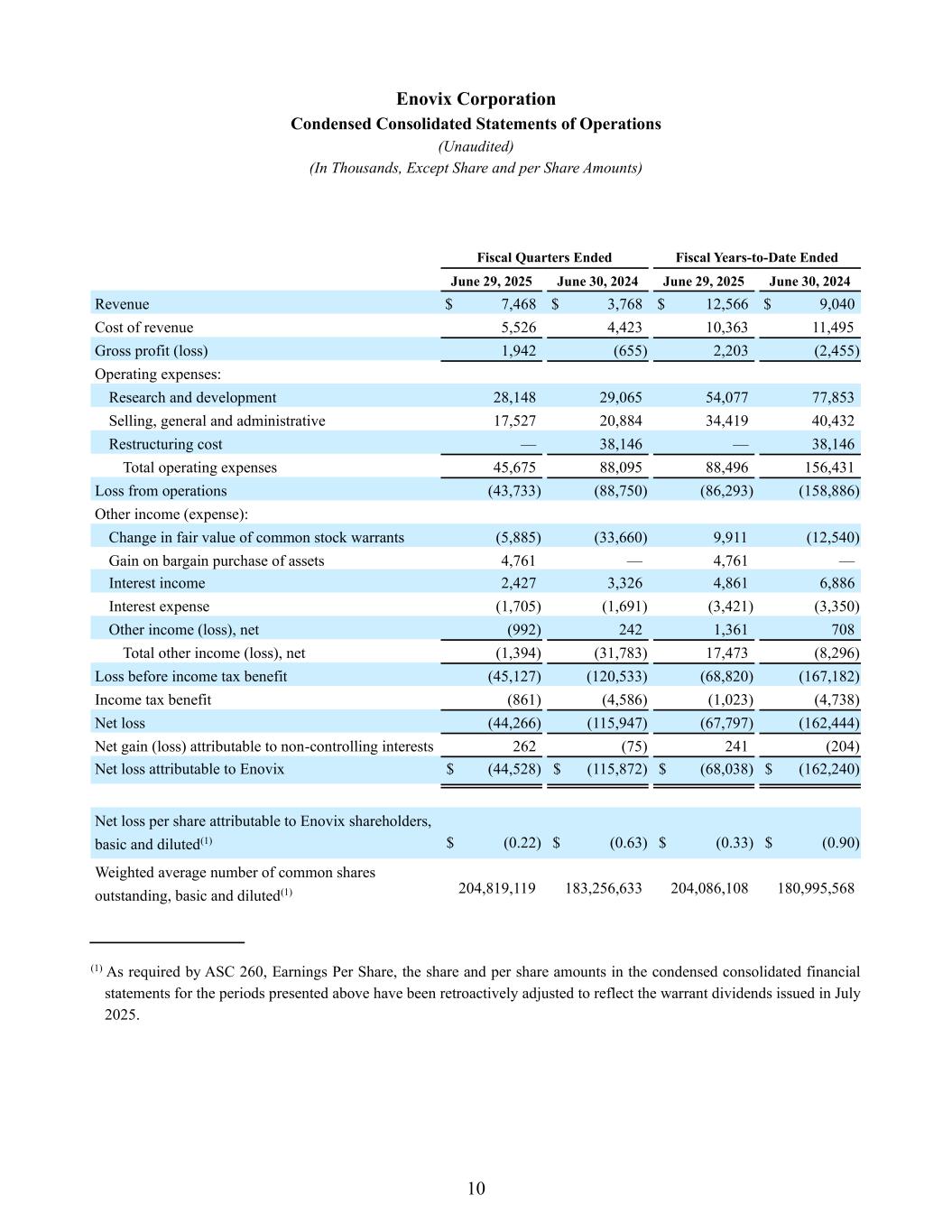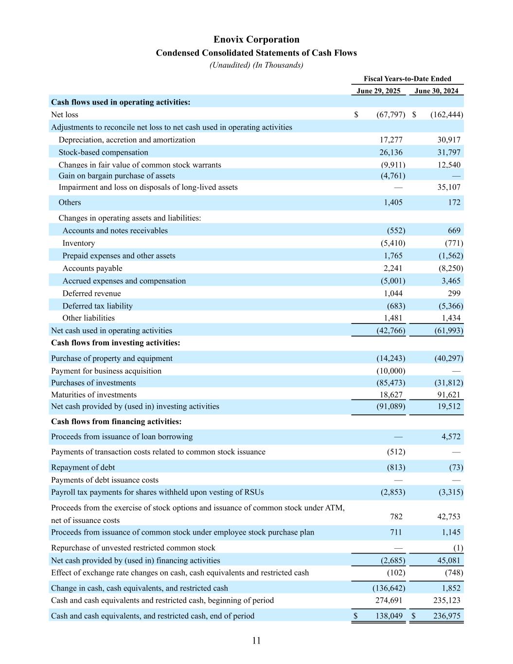 10 Enovix Corporation Condensed Consolidated Statements of Operations (Unaudited) (In Thousands, Except Share and per Share Amounts) Fiscal Quarters Ended Fiscal Years-to-Date Ended June 29, 2025 June 30, 2024 June 29, 2025 June 30, 2024 Revenue $ 7,468 $ 3,768 $ 12,566 $ 9,040 Cost of revenue 5,526 4,423 10,363 11,495 Gross profit (loss) 1,942 (655) 2,203 (2,455) Operating expenses: Research and development 28,148 29,065 54,077 77,853 Selling, general and administrative 17,527 20,884 34,419 40,432 Restructuring cost — 38,146 — 38,146 Total operating expenses 45,675 88,095 88,496 156,431 Loss from operations (43,733) (88,750) (86,293) (158,886) Other income (expense): Change in fair value of common stock warrants (5,885) (33,660) 9,911 (12,540) Gain on bargain purchase of assets 4,761 — 4,761 — Interest income 2,427 3,326 4,861 6,886 Interest expense (1,705) (1,691) (3,421) (3,350) Other income (loss), net (992) 242 1,361 708 Total other income (loss), net (1,394) (31,783) 17,473 (8,296) Loss before income tax benefit (45,127) (120,533) (68,820) (167,182) Income tax benefit (861) (4,586) (1,023) (4,738) Net loss (44,266) (115,947) (67,797) (162,444) Net gain (loss) attributable to non-controlling interests 262 (75) 241 (204) Net loss attributable to Enovix $ (44,528) $ (115,872) $ (68,038) $ (162,240) Net loss per share attributable to Enovix shareholders, basic and diluted(1) $ (0.22) $ (0.63) $ (0.33) $ (0.90) Weighted average number of common shares outstanding, basic and diluted(1) 204,819,119 183,256,633 204,086,108 180,995,568 (1) As required by ASC 260, Earnings Per Share, the share and per share amounts in the condensed consolidated financial statements for the periods presented above have been retroactively adjusted to reflect the warrant dividends issued in July 2025.
