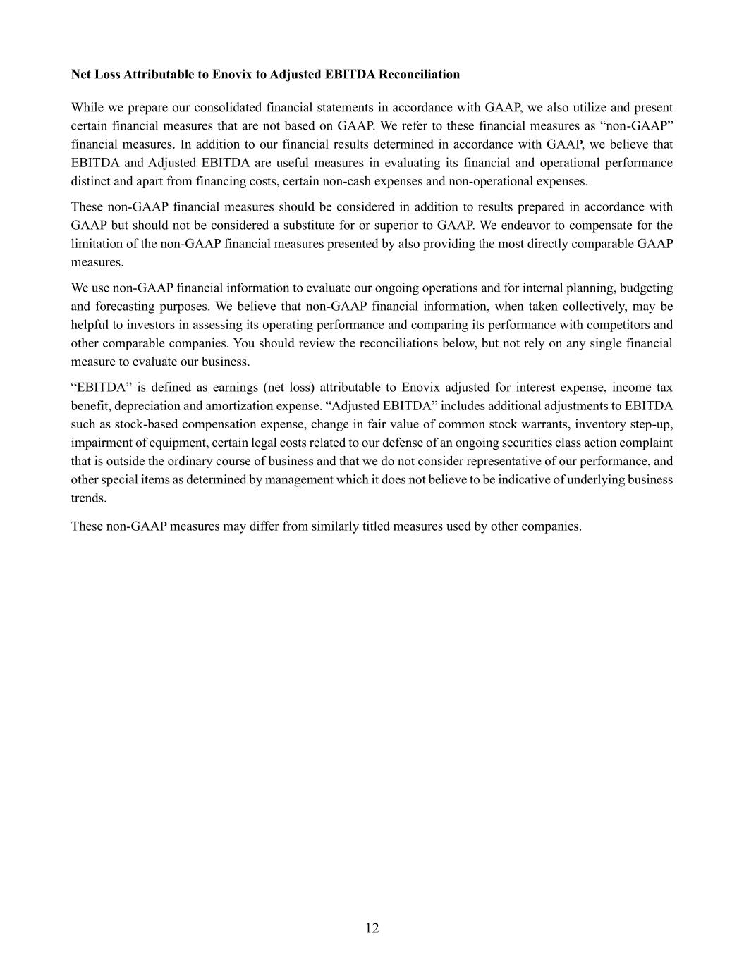 12 Net Loss Attributable to Enovix to Adjusted EBITDA Reconciliation While we prepare our consolidated financial statements in accordance with GAAP, we also utilize and present certain financial measures that are not based on GAAP. We refer to these financial measures as “non-GAAP” financial measures. In addition to our financial results determined in accordance with GAAP, we believe that EBITDA and Adjusted EBITDA are useful measures in evaluating its financial and operational performance distinct and apart from financing costs, certain non-cash expenses and non-operational expenses. These non-GAAP financial measures should be considered in addition to results prepared in accordance with GAAP but should not be considered a substitute for or superior to GAAP. We endeavor to compensate for the limitation of the non-GAAP financial measures presented by also providing the most directly comparable GAAP measures. We use non-GAAP financial information to evaluate our ongoing operations and for internal planning, budgeting and forecasting purposes. We believe that non-GAAP financial information, when taken collectively, may be helpful to investors in assessing its operating performance and comparing its performance with competitors and other comparable companies. You should review the reconciliations below, but not rely on any single financial measure to evaluate our business. “EBITDA” is defined as earnings (net loss) attributable to Enovix adjusted for interest expense, income tax benefit, depreciation and amortization expense. “Adjusted EBITDA” includes additional adjustments to EBITDA such as stock-based compensation expense, change in fair value of common stock warrants, inventory step-up, impairment of equipment, certain legal costs related to our defense of an ongoing securities class action complaint that is outside the ordinary course of business and that we do not consider representative of our performance, and other special items as determined by management which it does not believe to be indicative of underlying business trends. These non-GAAP measures may differ from similarly titled measures used by other companies.