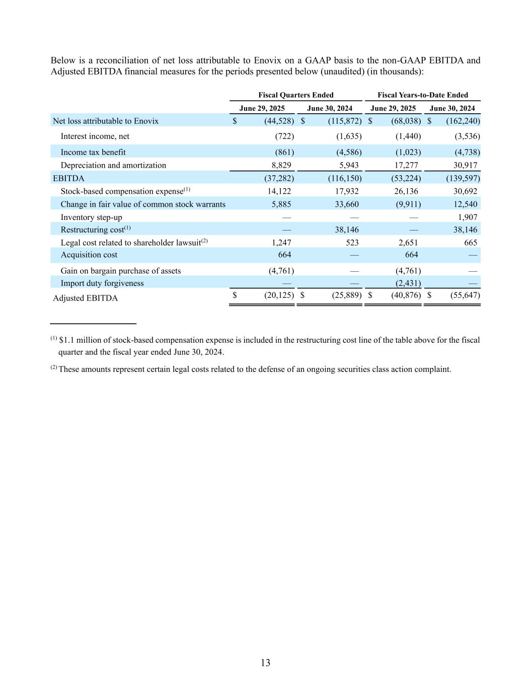 13 Below is a reconciliation of net loss attributable to Enovix on a GAAP basis to the non-GAAP EBITDA and Adjusted EBITDA financial measures for the periods presented below (unaudited) (in thousands): Fiscal Quarters Ended Fiscal Years-to-Date Ended June 29, 2025 June 30, 2024 June 29, 2025 June 30, 2024 Net loss attributable to Enovix $ (44,528) $ (115,872) $ (68,038) $ (162,240) Interest income, net (722) (1,635) (1,440) (3,536) Income tax benefit (861) (4,586) (1,023) (4,738) Depreciation and amortization 8,829 5,943 17,277 30,917 EBITDA (37,282) (116,150) (53,224) (139,597) Stock-based compensation expense(1) 14,122 17,932 26,136 30,692 Change in fair value of common stock warrants 5,885 33,660 (9,911) 12,540 Inventory step-up — — — 1,907 Restructuring cost(1) — 38,146 — 38,146 Legal cost related to shareholder lawsuit(2) 1,247 523 2,651 665 Acquisition cost 664 — 664 — Gain on bargain purchase of assets (4,761) — (4,761) — Import duty forgiveness — — (2,431) — Adjusted EBITDA $ (20,125) $ (25,889) $ (40,876) $ (55,647) (1) $1.1 million of stock-based compensation expense is included in the restructuring cost line of the table above for the fiscal quarter and the fiscal year ended June 30, 2024. (2) These amounts represent certain legal costs related to the defense of an ongoing securities class action complaint.