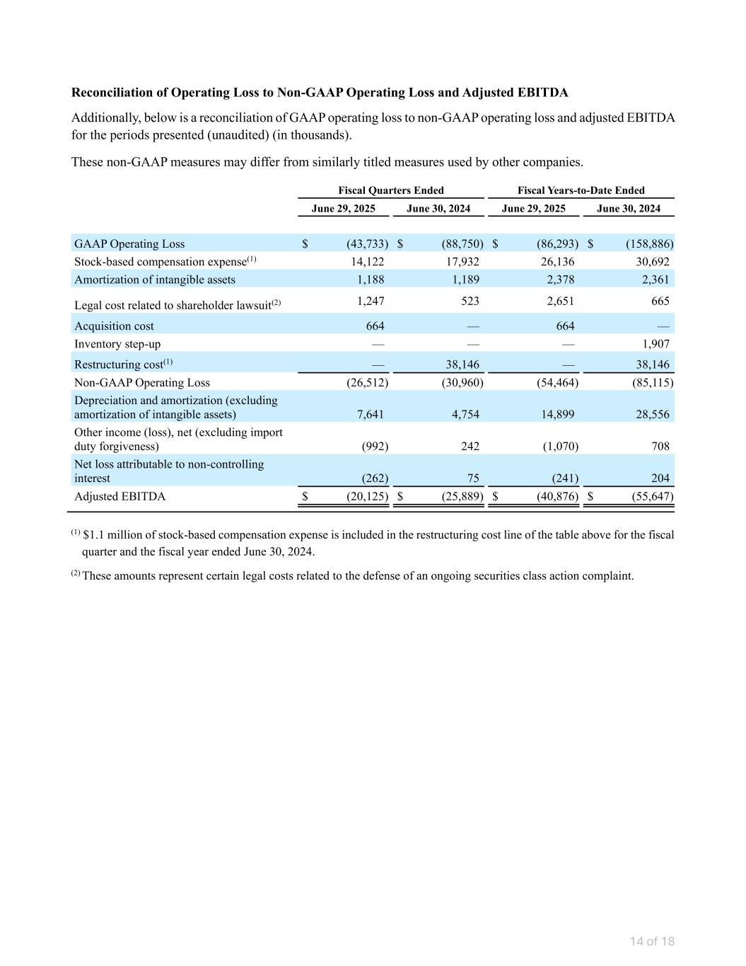 14 of 18 Reconciliation of Operating Loss to Non-GAAP Operating Loss and Adjusted EBITDA Additionally, below is a reconciliation of GAAP operating loss to non-GAAP operating loss and adjusted EBITDA for the periods presented (unaudited) (in thousands). These non-GAAP measures may differ from similarly titled measures used by other companies. Fiscal Quarters Ended Fiscal Years-to-Date Ended June 29, 2025 June 30, 2024 June 29, 2025 June 30, 2024 GAAP Operating Loss $ (43,733) $ (88,750) $ (86,293) $ (158,886) Stock-based compensation expense(1) 14,122 17,932 26,136 30,692 Amortization of intangible assets 1,188 1,189 2,378 2,361 Legal cost related to shareholder lawsuit(2) 1,247 523 2,651 665 Acquisition cost 664 — 664 — Inventory step-up — — — 1,907 Restructuring cost(1) — 38,146 — 38,146 Non-GAAP Operating Loss (26,512) (30,960) (54,464) (85,115) Depreciation and amortization (excluding amortization of intangible assets) 7,641 4,754 14,899 28,556 Other income (loss), net (excluding import duty forgiveness) (992) 242 (1,070) 708 Net loss attributable to non-controlling interest (262) 75 (241) 204 Adjusted EBITDA $ (20,125) $ (25,889) $ (40,876) $ (55,647) (1) $1.1 million of stock-based compensation expense is included in the restructuring cost line of the table above for the fiscal quarter and the fiscal year ended June 30, 2024. (2) These amounts represent certain legal costs related to the defense of an ongoing securities class action complaint.