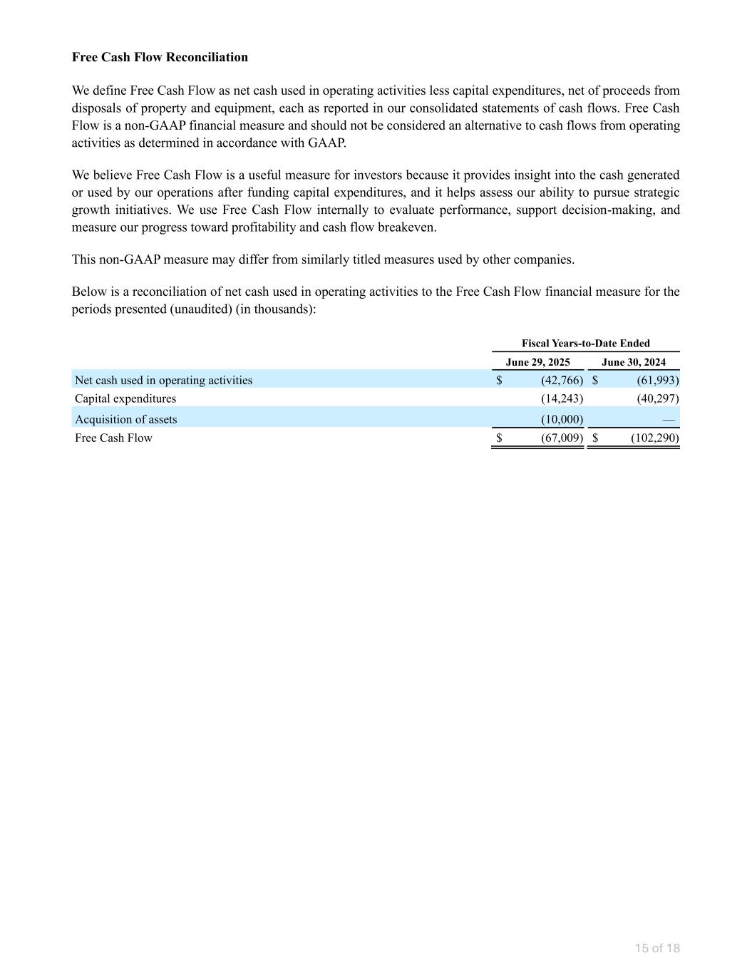 15 of 18 Free Cash Flow Reconciliation We define Free Cash Flow as net cash used in operating activities less capital expenditures, net of proceeds from disposals of property and equipment, each as reported in our consolidated statements of cash flows. Free Cash Flow is a non-GAAP financial measure and should not be considered an alternative to cash flows from operating activities as determined in accordance with GAAP. We believe Free Cash Flow is a useful measure for investors because it provides insight into the cash generated or used by our operations after funding capital expenditures, and it helps assess our ability to pursue strategic growth initiatives. We use Free Cash Flow internally to evaluate performance, support decision-making, and measure our progress toward profitability and cash flow breakeven. This non-GAAP measure may differ from similarly titled measures used by other companies. Below is a reconciliation of net cash used in operating activities to the Free Cash Flow financial measure for the periods presented (unaudited) (in thousands): Fiscal Years-to-Date Ended June 29, 2025 June 30, 2024 Net cash used in operating activities $ (42,766) $ (61,993) Capital expenditures (14,243) (40,297) Acquisition of assets (10,000) — Free Cash Flow $ (67,009) $ (102,290)