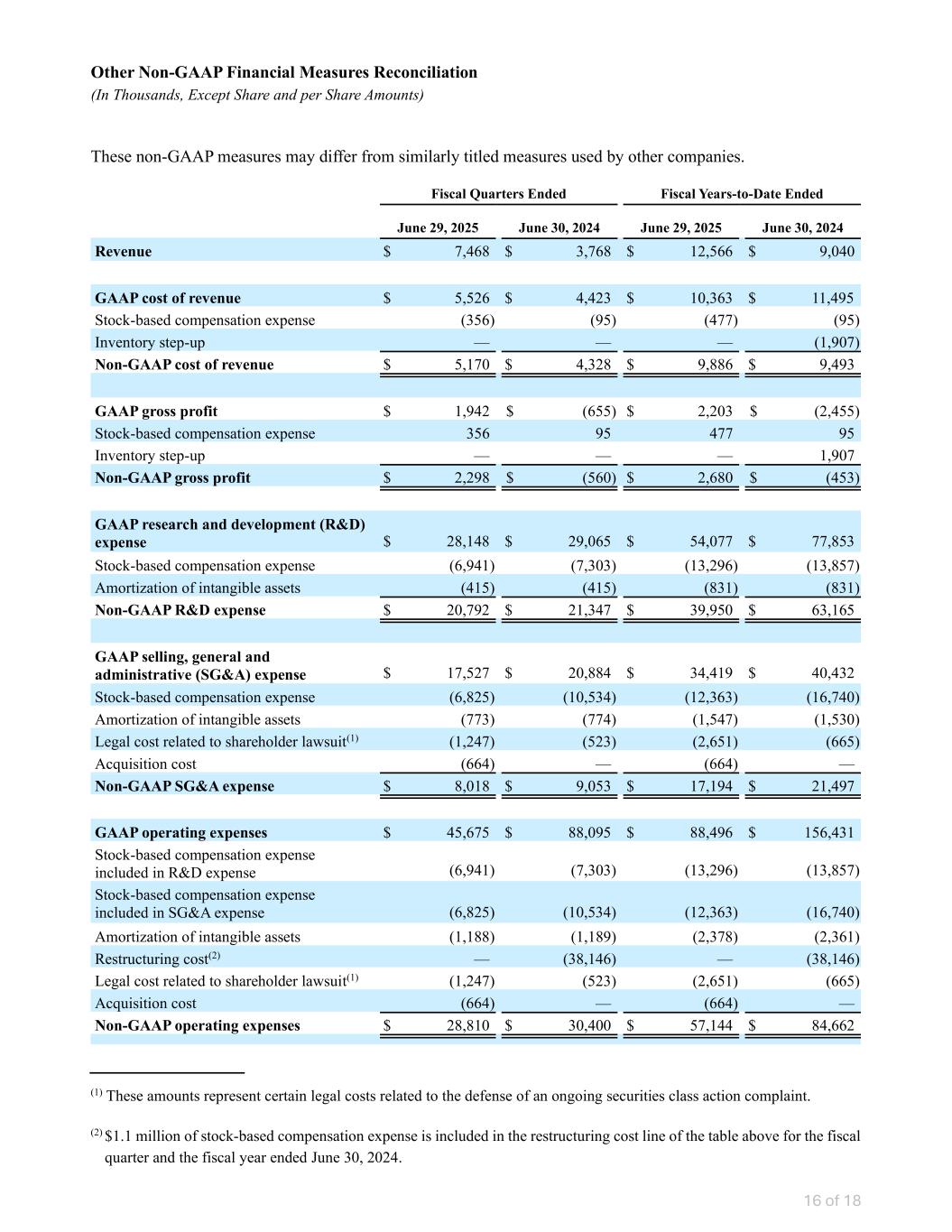 16 of 18 Other Non-GAAP Financial Measures Reconciliation (In Thousands, Except Share and per Share Amounts) These non-GAAP measures may differ from similarly titled measures used by other companies. Fiscal Quarters Ended Fiscal Years-to-Date Ended June 29, 2025 June 30, 2024 June 29, 2025 June 30, 2024 Revenue $ 7,468 $ 3,768 $ 12,566 $ 9,040 GAAP cost of revenue $ 5,526 $ 4,423 $ 10,363 $ 11,495 Stock-based compensation expense (356) (95) (477) (95) Inventory step-up — — — (1,907) Non-GAAP cost of revenue $ 5,170 $ 4,328 $ 9,886 $ 9,493 GAAP gross profit $ 1,942 $ (655) $ 2,203 $ (2,455) Stock-based compensation expense 356 95 477 95 Inventory step-up — — — 1,907 Non-GAAP gross profit $ 2,298 $ (560) $ 2,680 $ (453) GAAP research and development (R&D) expense $ 28,148 $ 29,065 $ 54,077 $ 77,853 Stock-based compensation expense (6,941) (7,303) (13,296) (13,857) Amortization of intangible assets (415) (415) (831) (831) Non-GAAP R&D expense $ 20,792 $ 21,347 $ 39,950 $ 63,165 GAAP selling, general and administrative (SG&A) expense $ 17,527 $ 20,884 $ 34,419 $ 40,432 Stock-based compensation expense (6,825) (10,534) (12,363) (16,740) Amortization of intangible assets (773) (774) (1,547) (1,530) Legal cost related to shareholder lawsuit(1) (1,247) (523) (2,651) (665) Acquisition cost (664) — (664) — Non-GAAP SG&A expense $ 8,018 $ 9,053 $ 17,194 $ 21,497 GAAP operating expenses $ 45,675 $ 88,095 $ 88,496 $ 156,431 Stock-based compensation expense included in R&D expense (6,941) (7,303) (13,296) (13,857) Stock-based compensation expense included in SG&A expense (6,825) (10,534) (12,363) (16,740) Amortization of intangible assets (1,188) (1,189) (2,378) (2,361) Restructuring cost(2) — (38,146) — (38,146) Legal cost related to shareholder lawsuit(1) (1,247) (523) (2,651) (665) Acquisition cost (664) — (664) — Non-GAAP operating expenses $ 28,810 $ 30,400 $ 57,144 $ 84,662 (1) These amounts represent certain legal costs related to the defense of an ongoing securities class action complaint. (2) $1.1 million of stock-based compensation expense is included in the restructuring cost line of the table above for the fiscal quarter and the fiscal year ended June 30, 2024.