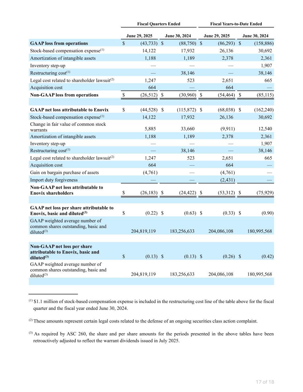 17 of 18 Fiscal Quarters Ended Fiscal Years-to-Date Ended June 29, 2025 June 30, 2024 June 29, 2025 June 30, 2024 GAAP loss from operations $ (43,733) $ (88,750) $ (86,293) $ (158,886) Stock-based compensation expense(1) 14,122 17,932 26,136 30,692 Amortization of intangible assets 1,188 1,189 2,378 2,361 Inventory step-up — — — 1,907 Restructuring cost(1) — 38,146 — 38,146 Legal cost related to shareholder lawsuit(2) 1,247 523 2,651 665 Acquisition cost 664 — 664 — Non-GAAP loss from operations $ (26,512) $ (30,960) $ (54,464) $ (85,115) GAAP net loss attributable to Enovix $ (44,528) $ (115,872) $ (68,038) $ (162,240) Stock-based compensation expense(1) 14,122 17,932 26,136 30,692 Change in fair value of common stock warrants 5,885 33,660 (9,911) 12,540 Amortization of intangible assets 1,188 1,189 2,378 2,361 Inventory step-up — — — 1,907 Restructuring cost(1) — 38,146 — 38,146 Legal cost related to shareholder lawsuit(2) 1,247 523 2,651 665 Acquisition cost 664 — 664 — Gain on bargain purchase of assets (4,761) — (4,761) — Import duty forgiveness — — (2,431) — Non-GAAP net loss attributable to Enovix shareholders $ (26,183) $ (24,422) $ (53,312) $ (75,929) GAAP net loss per share attributable to Enovix, basic and diluted(3) $ (0.22) $ (0.63) $ (0.33) $ (0.90) GAAP weighted average number of common shares outstanding, basic and diluted(3) 204,819,119 183,256,633 204,086,108 180,995,568 Non-GAAP net loss per share attributable to Enovix, basic and diluted(3) $ (0.13) $ (0.13) $ (0.26) $ (0.42) GAAP weighted average number of common shares outstanding, basic and diluted(3) 204,819,119 183,256,633 204,086,108 180,995,568 (1) $1.1 million of stock-based compensation expense is included in the restructuring cost line of the table above for the fiscal quarter and the fiscal year ended June 30, 2024. (2) These amounts represent certain legal costs related to the defense of an ongoing securities class action complaint. (3) As required by ASC 260, the share and per share amounts for the periods presented in the above tables have been retroactively adjusted to reflect the warrant dividends issued in July 2025.