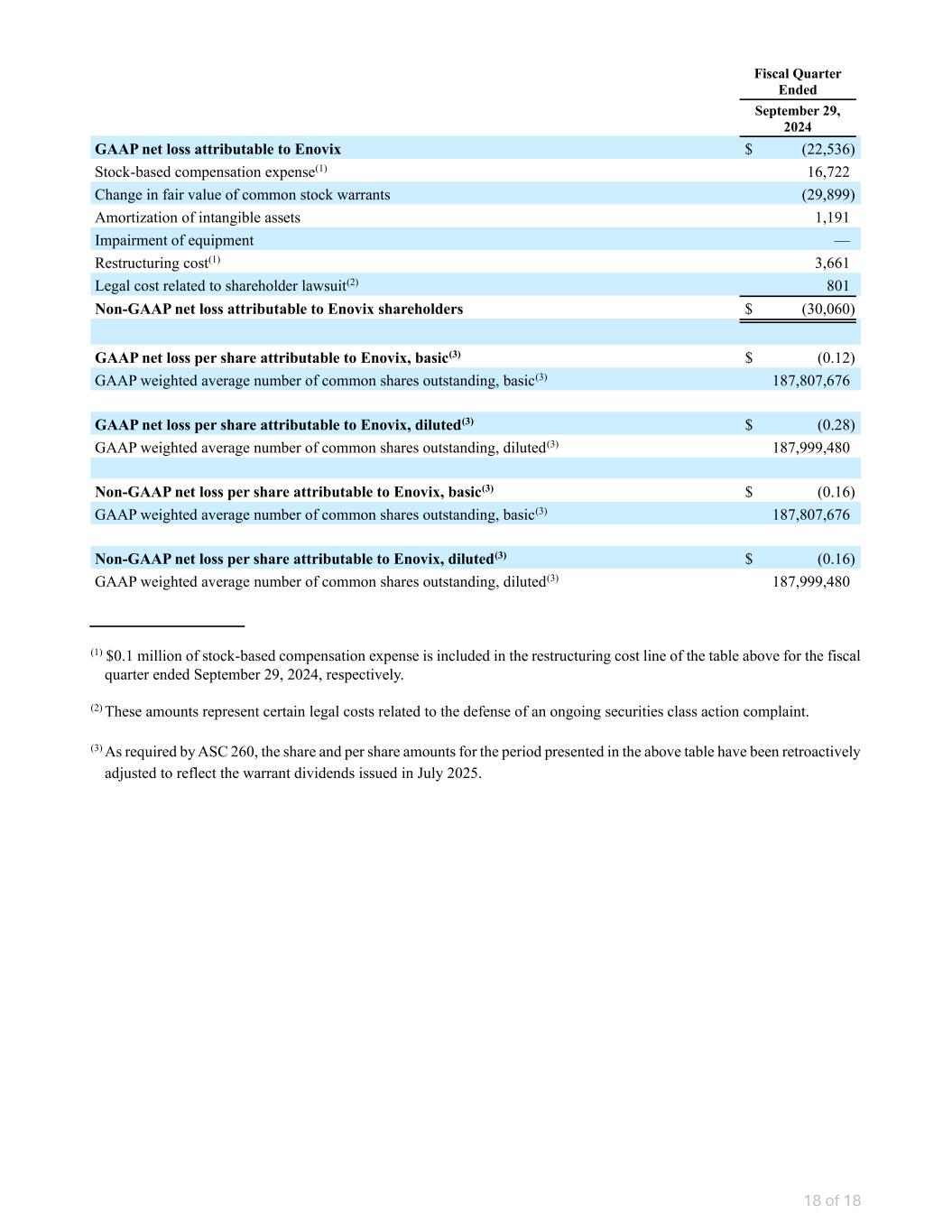 18 of 18 Fiscal Quarter Ended September 29, 2024 GAAP net loss attributable to Enovix $ (22,536) Stock-based compensation expense(1) 16,722 Change in fair value of common stock warrants (29,899) Amortization of intangible assets 1,191 Impairment of equipment — Restructuring cost(1) 3,661 Legal cost related to shareholder lawsuit(2) 801 Non-GAAP net loss attributable to Enovix shareholders $ (30,060) GAAP net loss per share attributable to Enovix, basic(3) $ (0.12) GAAP weighted average number of common shares outstanding, basic(3) 187,807,676 GAAP net loss per share attributable to Enovix, diluted(3) $ (0.28) GAAP weighted average number of common shares outstanding, diluted(3) 187,999,480 Non-GAAP net loss per share attributable to Enovix, basic(3) $ (0.16) GAAP weighted average number of common shares outstanding, basic(3) 187,807,676 Non-GAAP net loss per share attributable to Enovix, diluted(3) $ (0.16) GAAP weighted average number of common shares outstanding, diluted(3) 187,999,480 (1) $0.1 million of stock-based compensation expense is included in the restructuring cost line of the table above for the fiscal quarter ended September 29, 2024, respectively. (2) These amounts represent certain legal costs related to the defense of an ongoing securities class action complaint. (3) As required by ASC 260, the share and per share amounts for the period presented in the above table have been retroactively adjusted to reflect the warrant dividends issued in July 2025.