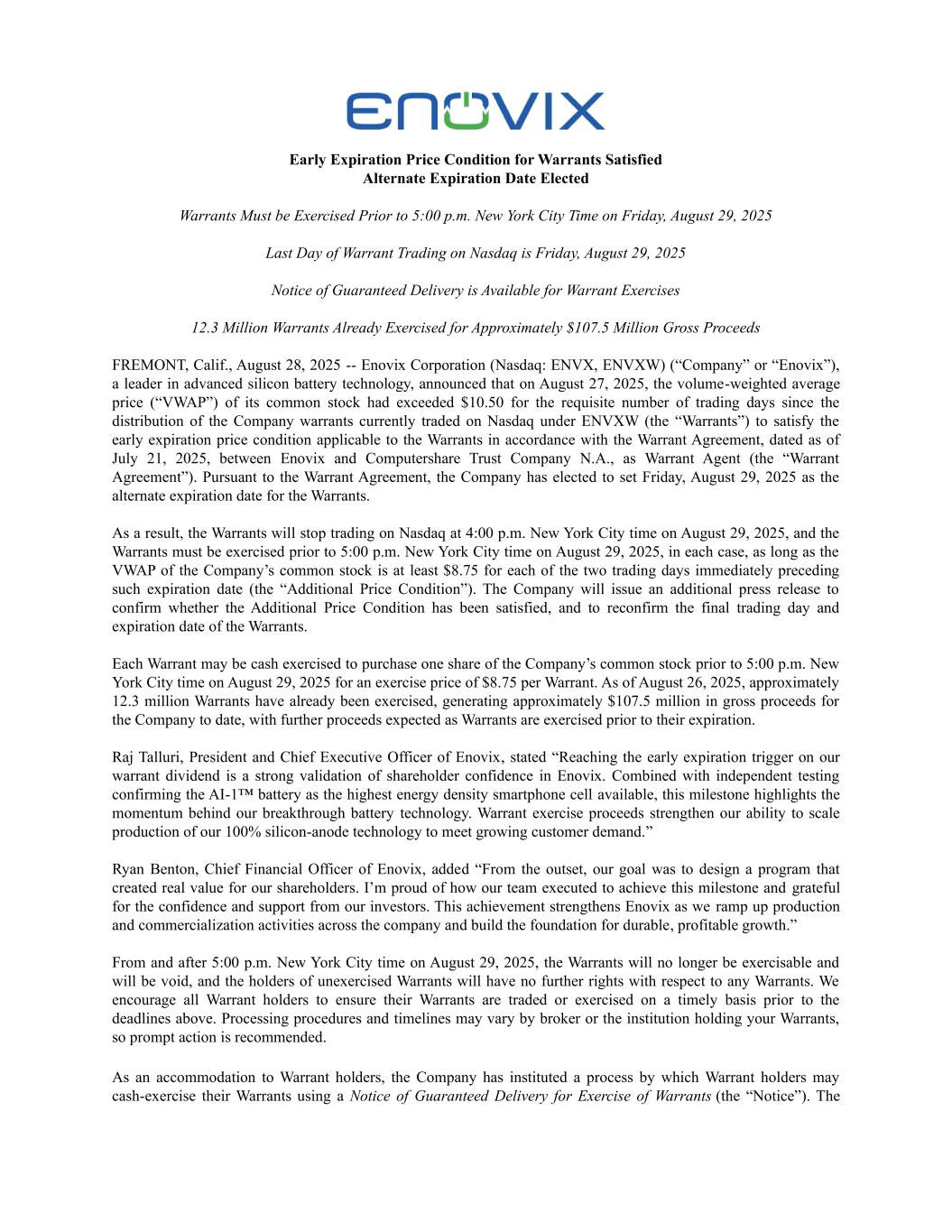 Early Expiration Price Condition for Warrants Satisfied Alternate Expiration Date Elected Warrants Must be Exercised Prior to 5:00 p.m. New York City Time on Friday, August 29, 2025 Last Day of Warrant Trading on Nasdaq is Friday, August 29, 2025 Notice of Guaranteed Delivery is Available for Warrant Exercises 12.3 Million Warrants Already Exercised for Approximately $107.5 Million Gross Proceeds FREMONT, Calif., August 28, 2025 -- Enovix Corporation (Nasdaq: ENVX, ENVXW) (“Company” or “Enovix”), a leader in advanced silicon battery technology, announced that on August 27, 2025, the volume-weighted average price (“VWAP”) of its common stock had exceeded $10.50 for the requisite number of trading days since the distribution of the Company warrants currently traded on Nasdaq under ENVXW (the “Warrants”) to satisfy the early expiration price condition applicable to the Warrants in accordance with the Warrant Agreement, dated as of July 21, 2025, between Enovix and Computershare Trust Company N.A., as Warrant Agent (the “Warrant Agreement”). Pursuant to the Warrant Agreement, the Company has elected to set Friday, August 29, 2025 as the alternate expiration date for the Warrants. As a result, the Warrants will stop trading on Nasdaq at 4:00 p.m. New York City time on August 29, 2025, and the Warrants must be exercised prior to 5:00 p.m. New York City time on August 29, 2025, in each case, as long as the VWAP of the Company’s common stock is at least $8.75 for each of the two trading days immediately preceding such expiration date (the “Additional Price Condition”). The Company will issue an additional press release to confirm whether the Additional Price Condition has been satisfied, and to reconfirm the final trading day and expiration date of the Warrants. Each Warrant may be cash exercised to purchase one share of the Company’s common stock prior to 5:00 p.m. New York City time on August 29, 2025 for an exercise price of $8.75 per Warrant. As of August 26, 2025, approximately 12.3 million Warrants have already been exercised, generating approximately $107.5 million in gross proceeds for the Company to date, with further proceeds expected as Warrants are exercised prior to their expiration. Raj Talluri, President and Chief Executive Officer of Enovix, stated “Reaching the early expiration trigger on our warrant dividend is a strong validation of shareholder confidence in Enovix. Combined with independent testing confirming the AI-1™ battery as the highest energy density smartphone cell available, this milestone highlights the momentum behind our breakthrough battery technology. Warrant exercise proceeds strengthen our ability to scale production of our 100% silicon-anode technology to meet growing customer demand.” Ryan Benton, Chief Financial Officer of Enovix, added “From the outset, our goal was to design a program that created real value for our shareholders. I’m proud of how our team executed to achieve this milestone and grateful for the confidence and support from our investors. This achievement strengthens Enovix as we ramp up production and commercialization activities across the company and build the foundation for durable, profitable growth.” From and after 5:00 p.m. New York City time on August 29, 2025, the Warrants will no longer be exercisable and will be void, and the holders of unexercised Warrants will have no further rights with respect to any Warrants. We encourage all Warrant holders to ensure their Warrants are traded or exercised on a timely basis prior to the deadlines above. Processing procedures and timelines may vary by broker or the institution holding your Warrants, so prompt action is recommended. As an accommodation to Warrant holders, the Company has instituted a process by which Warrant holders may cash-exercise their Warrants using a Notice of Guaranteed Delivery for Exercise of Warrants (the “Notice”). The
