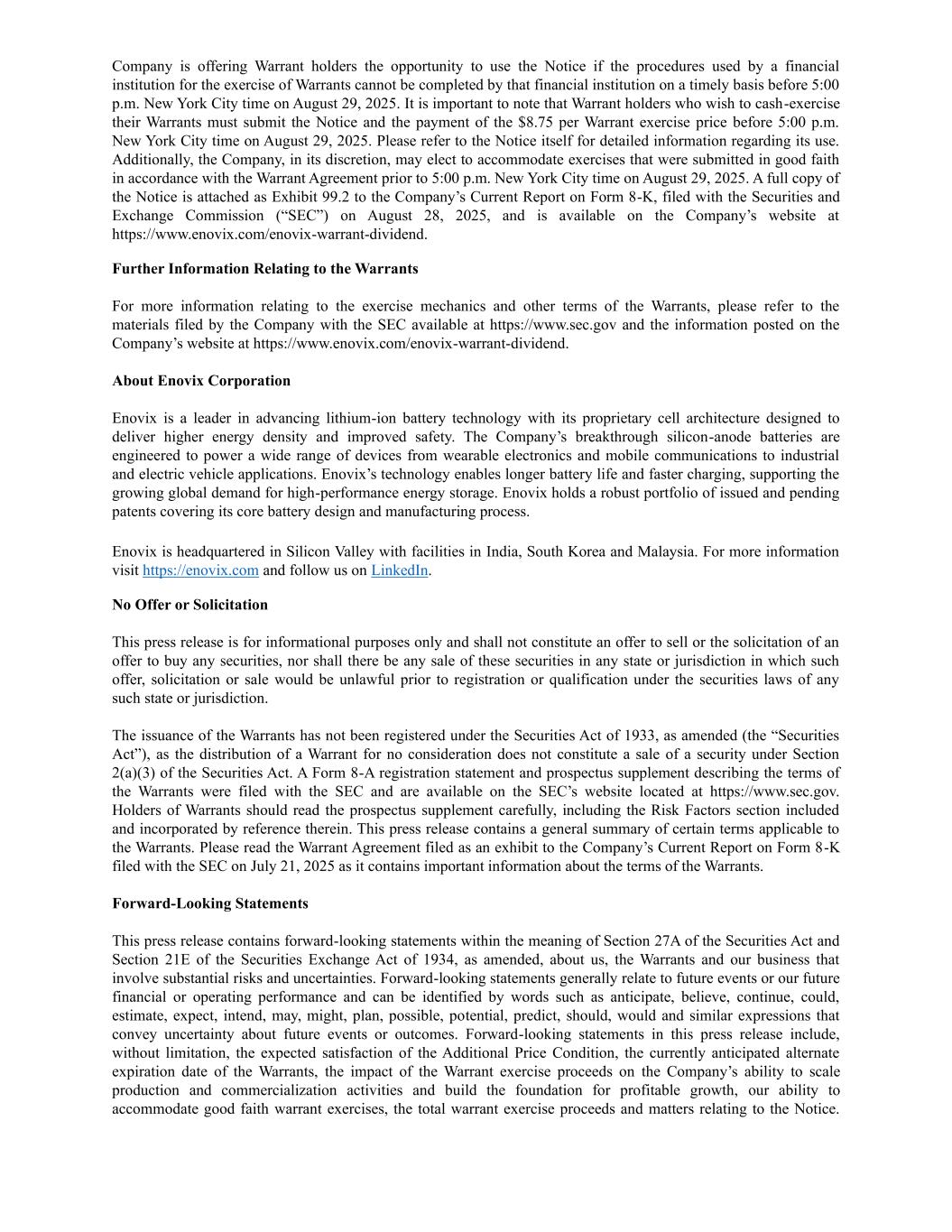Company is offering Warrant holders the opportunity to use the Notice if the procedures used by a financial institution for the exercise of Warrants cannot be completed by that financial institution on a timely basis before 5:00 p.m. New York City time on August 29, 2025. It is important to note that Warrant holders who wish to cash-exercise their Warrants must submit the Notice and the payment of the $8.75 per Warrant exercise price before 5:00 p.m. New York City time on August 29, 2025. Please refer to the Notice itself for detailed information regarding its use. Additionally, the Company, in its discretion, may elect to accommodate exercises that were submitted in good faith in accordance with the Warrant Agreement prior to 5:00 p.m. New York City time on August 29, 2025. A full copy of the Notice is attached as .2 to the Company’s Current Report on Form 8-K, filed with the Securities and Exchange Commission (“SEC”) on August 28, 2025, and is available on the Company’s website at https://www.enovix.com/enovix-warrant-dividend. Further Information Relating to the Warrants For more information relating to the exercise mechanics and other terms of the Warrants, please refer to the materials filed by the Company with the SEC available at https://www.sec.gov and the information posted on the Company’s website at https://www.enovix.com/enovix-warrant-dividend. About Enovix Corporation Enovix is a leader in advancing lithium-ion battery technology with its proprietary cell architecture designed to deliver higher energy density and improved safety. The Company’s breakthrough silicon-anode batteries are engineered to power a wide range of devices from wearable electronics and mobile communications to industrial and electric vehicle applications. Enovix’s technology enables longer battery life and faster charging, supporting the growing global demand for high-performance energy storage. Enovix holds a robust portfolio of issued and pending patents covering its core battery design and manufacturing process. Enovix is headquartered in Silicon Valley with facilities in India, South Korea and Malaysia. For more information visit https://enovix.com and follow us on LinkedIn. No Offer or Solicitation This press release is for informational purposes only and shall not constitute an offer to sell or the solicitation of an offer to buy any securities, nor shall there be any sale of these securities in any state or jurisdiction in which such offer, solicitation or sale would be unlawful prior to registration or qualification under the securities laws of any such state or jurisdiction. The issuance of the Warrants has not been registered under the Securities Act of 1933, as amended (the “Securities Act”), as the distribution of a Warrant for no consideration does not constitute a sale of a security under Section 2(a)(3) of the Securities Act. A Form 8-A registration statement and prospectus supplement describing the terms of the Warrants were filed with the SEC and are available on the SEC’s website located at https://www.sec.gov. Holders of Warrants should read the prospectus supplement carefully, including the Risk Factors section included and incorporated by reference therein. This press release contains a general summary of certain terms applicable to the Warrants. Please read the Warrant Agreement filed as an exhibit to the Company’s Current Report on Form 8-K filed with the SEC on July 21, 2025 as it contains important information about the terms of the Warrants. Forward‐Looking Statements This press release contains forward-looking statements within the meaning of Section 27A of the Securities Act and Section 21E of the Securities Exchange Act of 1934, as amended, about us, the Warrants and our business that involve substantial risks and uncertainties. Forward-looking statements generally relate to future events or our future financial or operating performance and can be identified by words such as anticipate, believe, continue, could, estimate, expect, intend, may, might, plan, possible, potential, predict, should, would and similar expressions that convey uncertainty about future events or outcomes. Forward-looking statements in this press release include, without limitation, the expected satisfaction of the Additional Price Condition, the currently anticipated alternate expiration date of the Warrants, the impact of the Warrant exercise proceeds on the Company’s ability to scale production and commercialization activities and build the foundation for profitable growth, our ability to accommodate good faith warrant exercises, the total warrant exercise proceeds and matters relating to the Notice.