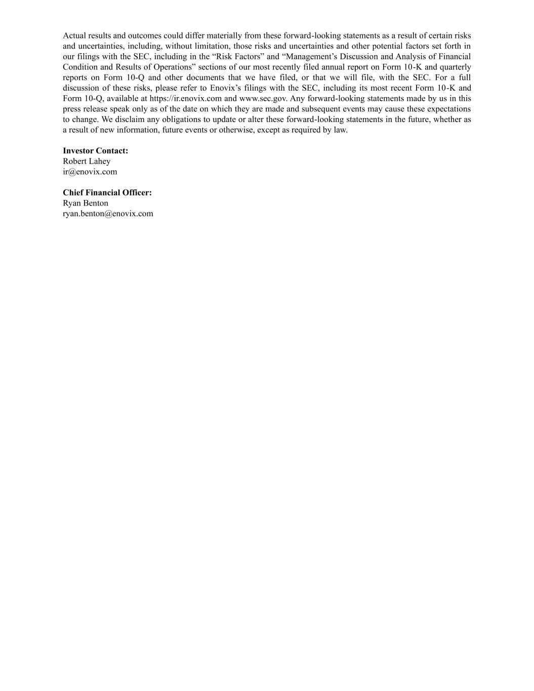 Actual results and outcomes could differ materially from these forward-looking statements as a result of certain risks and uncertainties, including, without limitation, those risks and uncertainties and other potential factors set forth in our filings with the SEC, including in the “Risk Factors” and “Management’s Discussion and Analysis of Financial Condition and Results of Operations” sections of our most recently filed annual report on Form 10-K and quarterly reports on Form 10-Q and other documents that we have filed, or that we will file, with the SEC. For a full discussion of these risks, please refer to Enovix’s filings with the SEC, including its most recent Form 10-K and Form 10-Q, available at https://ir.enovix.com and www.sec.gov. Any forward-looking statements made by us in this press release speak only as of the date on which they are made and subsequent events may cause these expectations to change. We disclaim any obligations to update or alter these forward-looking statements in the future, whether as a result of new information, future events or otherwise, except as required by law. Investor Contact: Robert Lahey ir@enovix.com Chief Financial Officer: Ryan Benton ryan.benton@enovix.com
