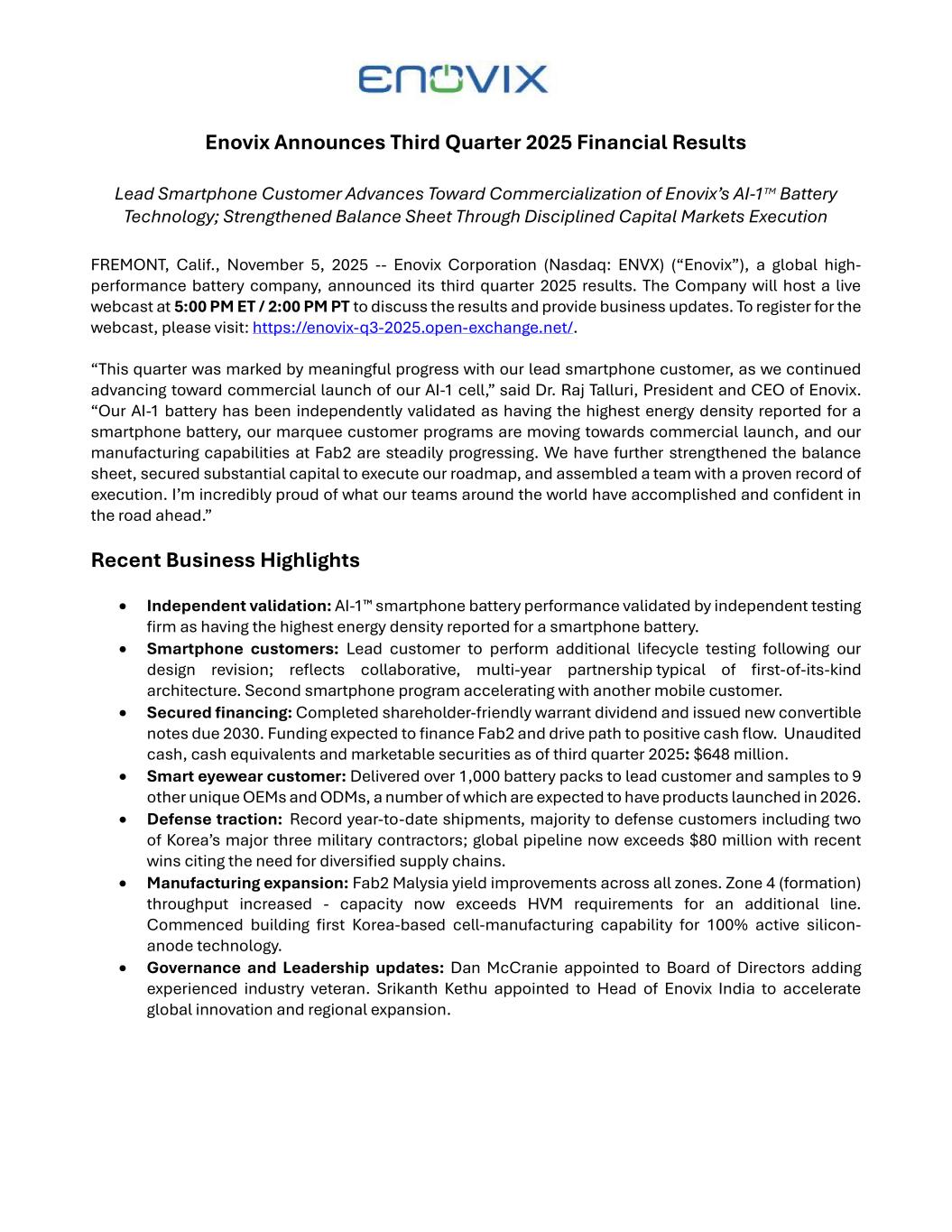 Enovix Announces Third Quarter 2025 Financial Results Lead Smartphone Customer Advances Toward Commercialization of Enovix’s AI-1TM Battery Technology; Strengthened Balance Sheet Through Disciplined Capital Markets Execution FREMONT, Calif., November 5, 2025 -- Enovix Corporation (Nasdaq: ENVX) (“Enovix”), a global high- performance battery company, announced its third quarter 2025 results. The Company will host a live webcast at 5:00 PM ET / 2:00 PM PT to discuss the results and provide business updates. To register for the webcast, please visit: https://enovix-q3-2025.open-exchange.net/. “This quarter was marked by meaningful progress with our lead smartphone customer, as we continued advancing toward commercial launch of our AI-1 cell,” said Dr. Raj Talluri, President and CEO of Enovix. “Our AI-1 battery has been independently validated as having the highest energy density reported for a smartphone battery, our marquee customer programs are moving towards commercial launch, and our manufacturing capabilities at Fab2 are steadily progressing. We have further strengthened the balance sheet, secured substantial capital to execute our roadmap, and assembled a team with a proven record of execution. I’m incredibly proud of what our teams around the world have accomplished and confident in the road ahead.” Recent Business Highlights • Independent validation: AI-1™ smartphone battery performance validated by independent testing firm as having the highest energy density reported for a smartphone battery. • Smartphone customers: Lead customer to perform additional lifecycle testing following our design revision; reflects collaborative, multi-year partnership typical of first-of-its-kind architecture. Second smartphone program accelerating with another mobile customer. • Secured financing: Completed shareholder-friendly warrant dividend and issued new convertible notes due 2030. Funding expected to finance Fab2 and drive path to positive cash flow. Unaudited cash, cash equivalents and marketable securities as of third quarter 2025: $648 million. • Smart eyewear customer: Delivered over 1,000 battery packs to lead customer and samples to 9 other unique OEMs and ODMs, a number of which are expected to have products launched in 2026. • Defense traction: Record year-to-date shipments, majority to defense customers including two of Korea’s major three military contractors; global pipeline now exceeds $80 million with recent wins citing the need for diversified supply chains. • Manufacturing expansion: Fab2 Malysia yield improvements across all zones. Zone 4 (formation) throughput increased - capacity now exceeds HVM requirements for an additional line. Commenced building first Korea-based cell-manufacturing capability for 100% active silicon- anode technology. • Governance and Leadership updates: Dan McCranie appointed to Board of Directors adding experienced industry veteran. Srikanth Kethu appointed to Head of Enovix India to accelerate global innovation and regional expansion.