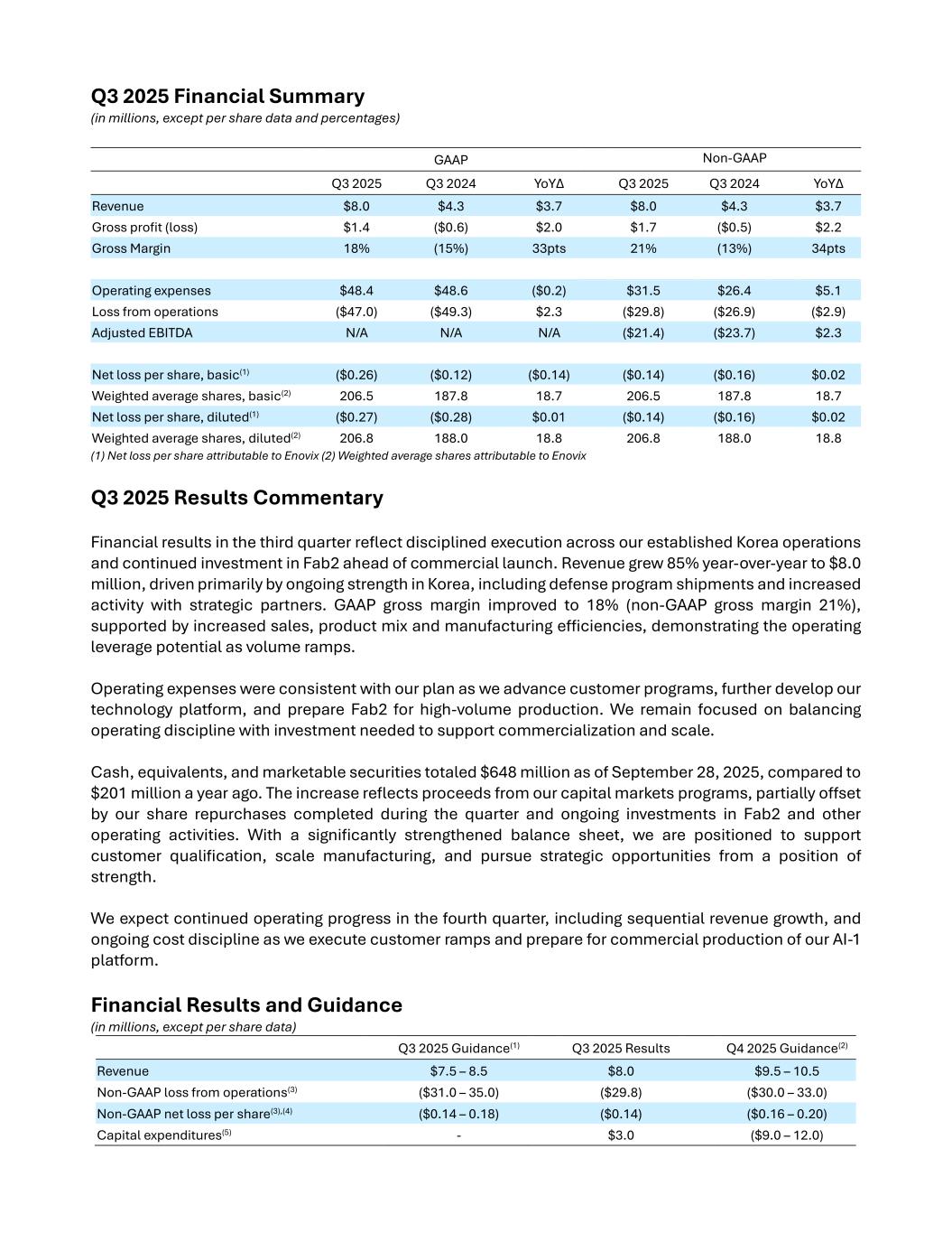 Q3 2025 Financial Summary (in millions, except per share data and percentages) GAAP Non-GAAP Q3 2025 Q3 2024 YoYΔ Q3 2025 Q3 2024 YoYΔ Revenue $8.0 $4.3 $3.7 $8.0 $4.3 $3.7 Gross profit (loss) $1.4 ($0.6) $2.0 $1.7 ($0.5) $2.2 Gross Margin 18% (15%) 33pts 21% (13%) 34pts Operating expenses $48.4 $48.6 ($0.2) $31.5 $26.4 $5.1 Loss from operations ($47.0) ($49.3) $2.3 ($29.8) ($26.9) ($2.9) Adjusted EBITDA N/A N/A N/A ($21.4) ($23.7) $2.3 Net loss per share, basic(1) ($0.26) ($0.12) ($0.14) ($0.14) ($0.16) $0.02 Weighted average shares, basic(2) 206.5 187.8 18.7 206.5 187.8 18.7 Net loss per share, diluted(1) ($0.27) ($0.28) $0.01 ($0.14) ($0.16) $0.02 Weighted average shares, diluted(2) 206.8 188.0 18.8 206.8 188.0 18.8 (1) Net loss per share attributable to Enovix (2) Weighted average shares attributable to Enovix Q3 2025 Results Commentary Financial results in the third quarter reflect disciplined execution across our established Korea operations and continued investment in Fab2 ahead of commercial launch. Revenue grew 85% year-over-year to $8.0 million, driven primarily by ongoing strength in Korea, including defense program shipments and increased activity with strategic partners. GAAP gross margin improved to 18% (non-GAAP gross margin 21%), supported by increased sales, product mix and manufacturing efficiencies, demonstrating the operating leverage potential as volume ramps. Operating expenses were consistent with our plan as we advance customer programs, further develop our technology platform, and prepare Fab2 for high-volume production. We remain focused on balancing operating discipline with investment needed to support commercialization and scale. Cash, equivalents, and marketable securities totaled $648 million as of September 28, 2025, compared to $201 million a year ago. The increase reflects proceeds from our capital markets programs, partially offset by our share repurchases completed during the quarter and ongoing investments in Fab2 and other operating activities. With a significantly strengthened balance sheet, we are positioned to support customer qualification, scale manufacturing, and pursue strategic opportunities from a position of strength. We expect continued operating progress in the fourth quarter, including sequential revenue growth, and ongoing cost discipline as we execute customer ramps and prepare for commercial production of our AI-1 platform. Financial Results and Guidance (in millions, except per share data) Q3 2025 Guidance(1) Q3 2025 Results Q4 2025 Guidance(2) Revenue $7.5 – 8.5 $8.0 $9.5 – 10.5 Non-GAAP loss from operations(3) ($31.0 – 35.0) ($29.8) ($30.0 – 33.0) Non-GAAP net loss per share(3),(4) ($0.14 – 0.18) ($0.14) ($0.16 – 0.20) Capital expenditures(5) - $3.0 ($9.0 – 12.0)