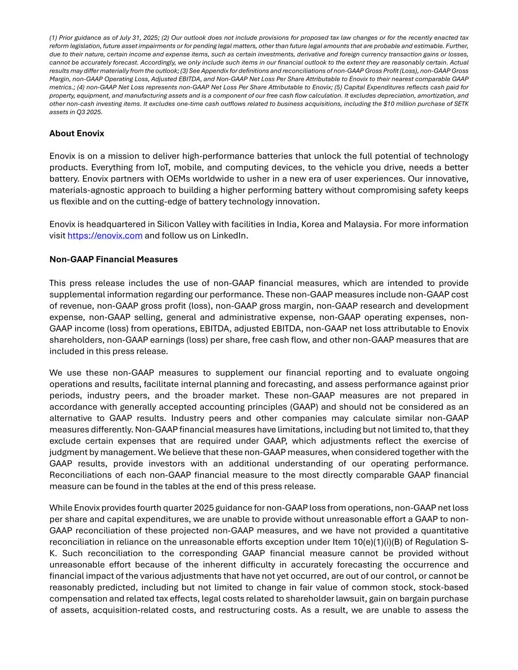(1) Prior guidance as of July 31, 2025; (2) Our outlook does not include provisions for proposed tax law changes or for the recently enacted tax reform legislation, future asset impairments or for pending legal matters, other than future legal amounts that are probable and estimable. Further, due to their nature, certain income and expense items, such as certain investments, derivative and foreign currency transaction gains or losses, cannot be accurately forecast. Accordingly, we only include such items in our financial outlook to the extent they are reasonably certain. Actual results may differ materially from the outlook; (3) See Appendix for definitions and reconciliations of non-GAAP Gross Profit (Loss), non-GAAP Gross Margin, non-GAAP Operating Loss, Adjusted EBITDA, and Non-GAAP Net Loss Per Share Attributable to Enovix to their nearest comparable GAAP metrics.; (4) non-GAAP Net Loss represents non-GAAP Net Loss Per Share Attributable to Enovix; (5) Capital Expenditures reflects cash paid for property, equipment, and manufacturing assets and is a component of our free cash flow calculation. It excludes depreciation, amortization, and other non-cash investing items. It excludes one-time cash outflows related to business acquisitions, including the $10 million purchase of SETK assets in Q3 2025. About Enovix Enovix is on a mission to deliver high-performance batteries that unlock the full potential of technology products. Everything from IoT, mobile, and computing devices, to the vehicle you drive, needs a better battery. Enovix partners with OEMs worldwide to usher in a new era of user experiences. Our innovative, materials-agnostic approach to building a higher performing battery without compromising safety keeps us flexible and on the cutting-edge of battery technology innovation. Enovix is headquartered in Silicon Valley with facilities in India, Korea and Malaysia. For more information visit https://enovix.com and follow us on LinkedIn. Non-GAAP Financial Measures This press release includes the use of non-GAAP financial measures, which are intended to provide supplemental information regarding our performance. These non-GAAP measures include non-GAAP cost of revenue, non-GAAP gross profit (loss), non-GAAP gross margin, non-GAAP research and development expense, non-GAAP selling, general and administrative expense, non-GAAP operating expenses, non- GAAP income (loss) from operations, EBITDA, adjusted EBITDA, non-GAAP net loss attributable to Enovix shareholders, non-GAAP earnings (loss) per share, free cash flow, and other non-GAAP measures that are included in this press release. We use these non-GAAP measures to supplement our financial reporting and to evaluate ongoing operations and results, facilitate internal planning and forecasting, and assess performance against prior periods, industry peers, and the broader market. These non-GAAP measures are not prepared in accordance with generally accepted accounting principles (GAAP) and should not be considered as an alternative to GAAP results. Industry peers and other companies may calculate similar non-GAAP measures differently. Non-GAAP financial measures have limitations, including but not limited to, that they exclude certain expenses that are required under GAAP, which adjustments reflect the exercise of judgment by management. We believe that these non-GAAP measures, when considered together with the GAAP results, provide investors with an additional understanding of our operating performance. Reconciliations of each non-GAAP financial measure to the most directly comparable GAAP financial measure can be found in the tables at the end of this press release. While Enovix provides fourth quarter 2025 guidance for non-GAAP loss from operations, non-GAAP net loss per share and capital expenditures, we are unable to provide without unreasonable effort a GAAP to non- GAAP reconciliation of these projected non-GAAP measures, and we have not provided a quantitative reconciliation in reliance on the unreasonable efforts exception under Item 10(e)(1)(i)(B) of Regulation S- K. Such reconciliation to the corresponding GAAP financial measure cannot be provided without unreasonable effort because of the inherent difficulty in accurately forecasting the occurrence and financial impact of the various adjustments that have not yet occurred, are out of our control, or cannot be reasonably predicted, including but not limited to change in fair value of common stock, stock-based compensation and related tax effects, legal costs related to shareholder lawsuit, gain on bargain purchase of assets, acquisition-related costs, and restructuring costs. As a result, we are unable to assess the
