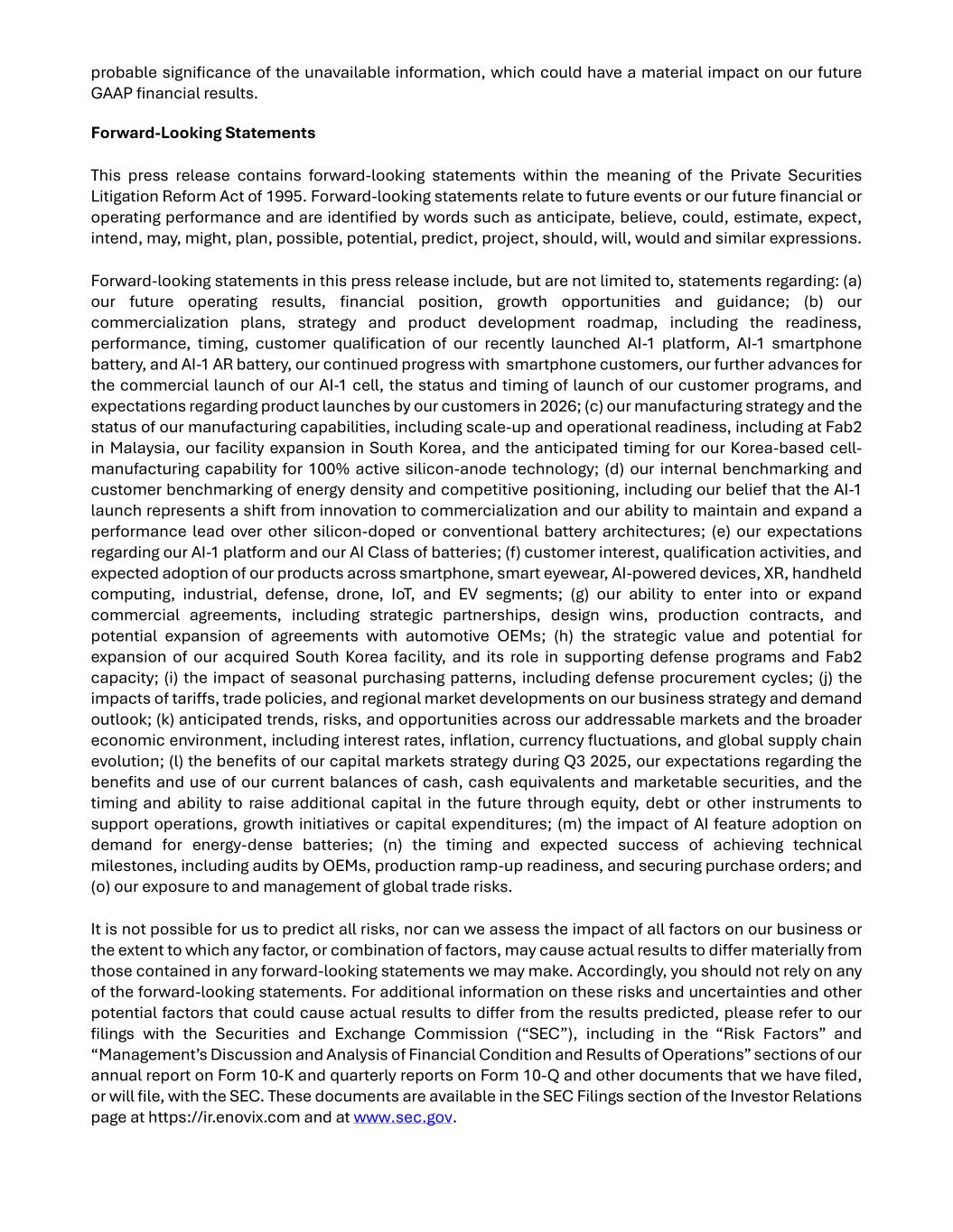 probable significance of the unavailable information, which could have a material impact on our future GAAP financial results. Forward-Looking Statements This press release contains forward-looking statements within the meaning of the Private Securities Litigation Reform Act of 1995. Forward-looking statements relate to future events or our future financial or operating performance and are identified by words such as anticipate, believe, could, estimate, expect, intend, may, might, plan, possible, potential, predict, project, should, will, would and similar expressions. Forward-looking statements in this press release include, but are not limited to, statements regarding: (a) our future operating results, financial position, growth opportunities and guidance; (b) our commercialization plans, strategy and product development roadmap, including the readiness, performance, timing, customer qualification of our recently launched AI-1 platform, AI-1 smartphone battery, and AI-1 AR battery, our continued progress with smartphone customers, our further advances for the commercial launch of our AI-1 cell, the status and timing of launch of our customer programs, and expectations regarding product launches by our customers in 2026; (c) our manufacturing strategy and the status of our manufacturing capabilities, including scale-up and operational readiness, including at Fab2 in Malaysia, our facility expansion in South Korea, and the anticipated timing for our Korea-based cell- manufacturing capability for 100% active silicon-anode technology; (d) our internal benchmarking and customer benchmarking of energy density and competitive positioning, including our belief that the AI-1 launch represents a shift from innovation to commercialization and our ability to maintain and expand a performance lead over other silicon-doped or conventional battery architectures; (e) our expectations regarding our AI-1 platform and our AI Class of batteries; (f) customer interest, qualification activities, and expected adoption of our products across smartphone, smart eyewear, AI-powered devices, XR, handheld computing, industrial, defense, drone, IoT, and EV segments; (g) our ability to enter into or expand commercial agreements, including strategic partnerships, design wins, production contracts, and potential expansion of agreements with automotive OEMs; (h) the strategic value and potential for expansion of our acquired South Korea facility, and its role in supporting defense programs and Fab2 capacity; (i) the impact of seasonal purchasing patterns, including defense procurement cycles; (j) the impacts of tariffs, trade policies, and regional market developments on our business strategy and demand outlook; (k) anticipated trends, risks, and opportunities across our addressable markets and the broader economic environment, including interest rates, inflation, currency fluctuations, and global supply chain evolution; (l) the benefits of our capital markets strategy during Q3 2025, our expectations regarding the benefits and use of our current balances of cash, cash equivalents and marketable securities, and the timing and ability to raise additional capital in the future through equity, debt or other instruments to support operations, growth initiatives or capital expenditures; (m) the impact of AI feature adoption on demand for energy-dense batteries; (n) the timing and expected success of achieving technical milestones, including audits by OEMs, production ramp-up readiness, and securing purchase orders; and (o) our exposure to and management of global trade risks. It is not possible for us to predict all risks, nor can we assess the impact of all factors on our business or the extent to which any factor, or combination of factors, may cause actual results to differ materially from those contained in any forward-looking statements we may make. Accordingly, you should not rely on any of the forward-looking statements. For additional information on these risks and uncertainties and other potential factors that could cause actual results to differ from the results predicted, please refer to our filings with the Securities and Exchange Commission (“SEC”), including in the “Risk Factors” and “Management’s Discussion and Analysis of Financial Condition and Results of Operations” sections of our annual report on Form 10-K and quarterly reports on Form 10-Q and other documents that we have filed, or will file, with the SEC. These documents are available in the SEC Filings section of the Investor Relations page at https://ir.enovix.com and at www.sec.gov.