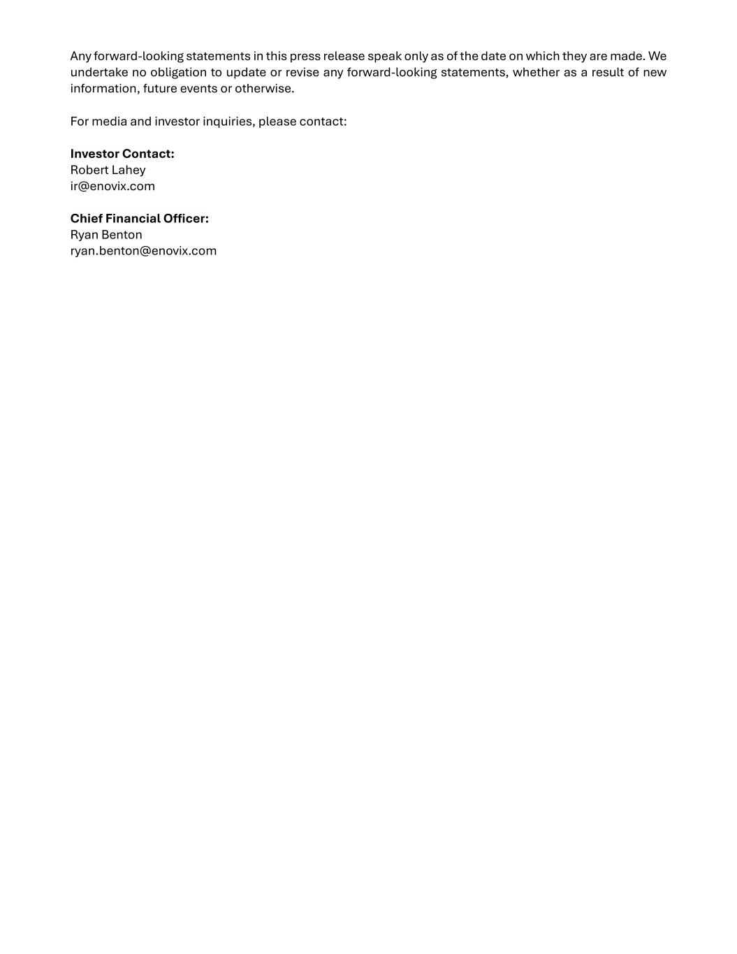 Any forward-looking statements in this press release speak only as of the date on which they are made. We undertake no obligation to update or revise any forward-looking statements, whether as a result of new information, future events or otherwise. For media and investor inquiries, please contact: Investor Contact: Robert Lahey ir@enovix.com Chief Financial Officer: Ryan Benton ryan.benton@enovix.com
