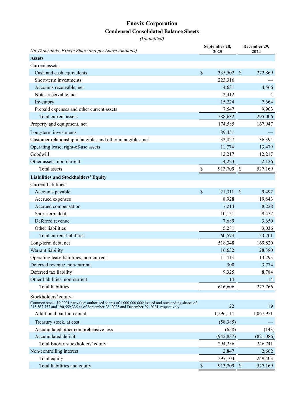 Enovix Corporation Condensed Consolidated Balance Sheets (Unaudited) (In Thousands, Except Share and per Share Amounts) September 28, 2025 December 29, 2024 Assets Current assets: Cash and cash equivalents $ 335,502 $ 272,869 Short-term investments 223,316 — Accounts receivable, net 4,631 4,566 Notes receivable, net 2,412 4 Inventory 15,224 7,664 Prepaid expenses and other current assets 7,547 9,903 Total current assets 588,632 295,006 Property and equipment, net 174,585 167,947 Long-term investments 89,451 — Customer relationship intangibles and other intangibles, net 32,827 36,394 Operating lease, right-of-use assets 11,774 13,479 Goodwill 12,217 12,217 Other assets, non-current 4,223 2,126 Total assets $ 913,709 $ 527,169 Liabilities and Stockholders’ Equity Current liabilities: Accounts payable $ 21,311 $ 9,492 Accrued expenses 8,928 19,843 Accrued compensation 7,214 8,228 Short-term debt 10,151 9,452 Deferred revenue 7,689 3,650 Other liabilities 5,281 3,036 Total current liabilities 60,574 53,701 Long-term debt, net 518,348 169,820 Warrant liability 16,632 28,380 Operating lease liabilities, non-current 11,413 13,293 Deferred revenue, non-current 300 3,774 Deferred tax liability 9,325 8,784 Other liabilities, non-current 14 14 Total liabilities 616,606 277,766 Stockholders’ equity: Common stock, $0.0001 par value; authorized shares of 1,000,000,000; issued and outstanding shares of 215,367,757 and 190,559,335 as of September 28, 2025 and December 29, 2024, respectively 22 19 Additional paid-in-capital 1,296,114 1,067,951 Treasury stock, at cost (58,385) — Accumulated other comprehensive loss (658) (143) Accumulated deficit (942,837) (821,086) Total Enovix stockholders’ equity 294,256 246,741 Non-controlling interest 2,847 2,662 Total equity 297,103 249,403 Total liabilities and equity $ 913,709 $ 527,169