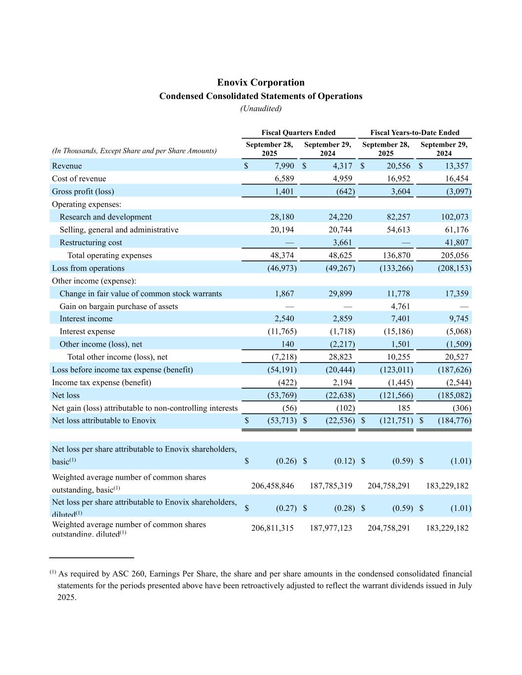 Enovix Corporation Condensed Consolidated Statements of Operations (Unaudited) Fiscal Quarters Ended Fiscal Years-to-Date Ended (In Thousands, Except Share and per Share Amounts) September 28, 2025 September 29, 2024 September 28, 2025 September 29, 2024 Revenue $ 7,990 $ 4,317 $ 20,556 $ 13,357 Cost of revenue 6,589 4,959 16,952 16,454 Gross profit (loss) 1,401 (642) 3,604 (3,097) Operating expenses: Research and development 28,180 24,220 82,257 102,073 Selling, general and administrative 20,194 20,744 54,613 61,176 Restructuring cost — 3,661 — 41,807 Total operating expenses 48,374 48,625 136,870 205,056 Loss from operations (46,973) (49,267) (133,266) (208,153) Other income (expense): Change in fair value of common stock warrants 1,867 29,899 11,778 17,359 Gain on bargain purchase of assets — — 4,761 — Interest income 2,540 2,859 7,401 9,745 Interest expense (11,765) (1,718) (15,186) (5,068) Other income (loss), net 140 (2,217) 1,501 (1,509) Total other income (loss), net (7,218) 28,823 10,255 20,527 Loss before income tax expense (benefit) (54,191) (20,444) (123,011) (187,626) Income tax expense (benefit) (422) 2,194 (1,445) (2,544) Net loss (53,769) (22,638) (121,566) (185,082) Net gain (loss) attributable to non-controlling interests (56) (102) 185 (306) Net loss attributable to Enovix $ (53,713) $ (22,536) $ (121,751) $ (184,776) Net loss per share attributable to Enovix shareholders, basic(1) $ (0.26) $ (0.12) $ (0.59) $ (1.01) Weighted average number of common shares outstanding, basic(1) 206,458,846 187,785,319 204,758,291 183,229,182 Net loss per share attributable to Enovix shareholders, diluted(1) $ (0.27) $ (0.28) $ (0.59) $ (1.01) Weighted average number of common shares outstanding, diluted(1) 206,811,315 187,977,123 204,758,291 183,229,182 (1) As required by ASC 260, Earnings Per Share, the share and per share amounts in the condensed consolidated financial statements for the periods presented above have been retroactively adjusted to reflect the warrant dividends issued in July 2025.