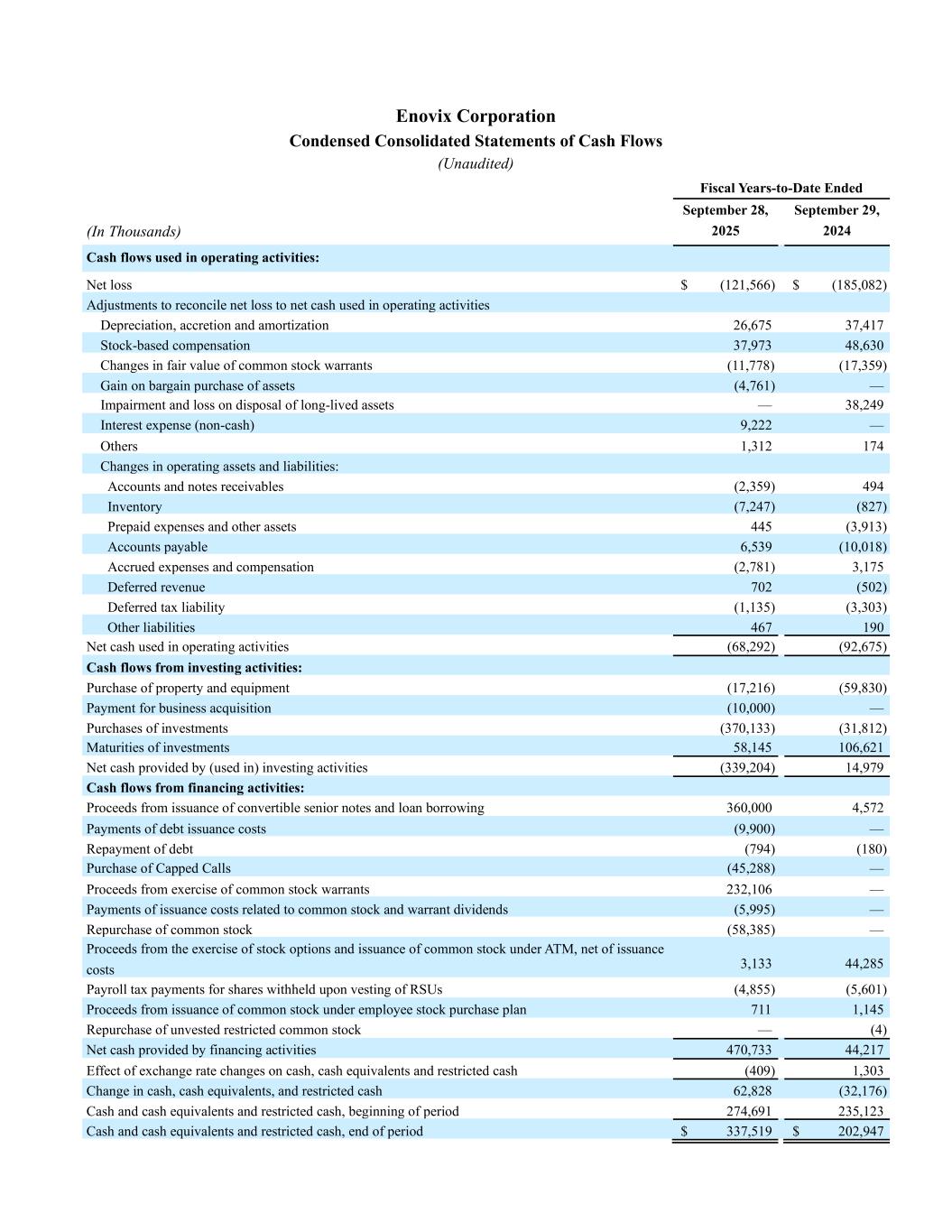 Enovix Corporation Condensed Consolidated Statements of Cash Flows (Unaudited) Fiscal Years-to-Date Ended (In Thousands) September 28, 2025 September 29, 2024 Cash flows used in operating activities: Net loss $ (121,566) $ (185,082) Adjustments to reconcile net loss to net cash used in operating activities Depreciation, accretion and amortization 26,675 37,417 Stock-based compensation 37,973 48,630 Changes in fair value of common stock warrants (11,778) (17,359) Gain on bargain purchase of assets (4,761) — Impairment and loss on disposal of long-lived assets — 38,249 Interest expense (non-cash) 9,222 — Others 1,312 174 Changes in operating assets and liabilities: Accounts and notes receivables (2,359) 494 Inventory (7,247) (827) Prepaid expenses and other assets 445 (3,913) Accounts payable 6,539 (10,018) Accrued expenses and compensation (2,781) 3,175 Deferred revenue 702 (502) Deferred tax liability (1,135) (3,303) Other liabilities 467 190 Net cash used in operating activities (68,292) (92,675) Cash flows from investing activities: Purchase of property and equipment (17,216) (59,830) Payment for business acquisition (10,000) — Purchases of investments (370,133) (31,812) Maturities of investments 58,145 106,621 Net cash provided by (used in) investing activities (339,204) 14,979 Cash flows from financing activities: Proceeds from issuance of convertible senior notes and loan borrowing 360,000 4,572 Payments of debt issuance costs (9,900) — Repayment of debt (794) (180) Purchase of Capped Calls (45,288) — Proceeds from exercise of common stock warrants 232,106 — Payments of issuance costs related to common stock and warrant dividends (5,995) — Repurchase of common stock (58,385) — Proceeds from the exercise of stock options and issuance of common stock under ATM, net of issuance costs 3,133 44,285 Payroll tax payments for shares withheld upon vesting of RSUs (4,855) (5,601) Proceeds from issuance of common stock under employee stock purchase plan 711 1,145 Repurchase of unvested restricted common stock — (4) Net cash provided by financing activities 470,733 44,217 Effect of exchange rate changes on cash, cash equivalents and restricted cash (409) 1,303 Change in cash, cash equivalents, and restricted cash 62,828 (32,176) Cash and cash equivalents and restricted cash, beginning of period 274,691 235,123 Cash and cash equivalents and restricted cash, end of period $ 337,519 $ 202,947