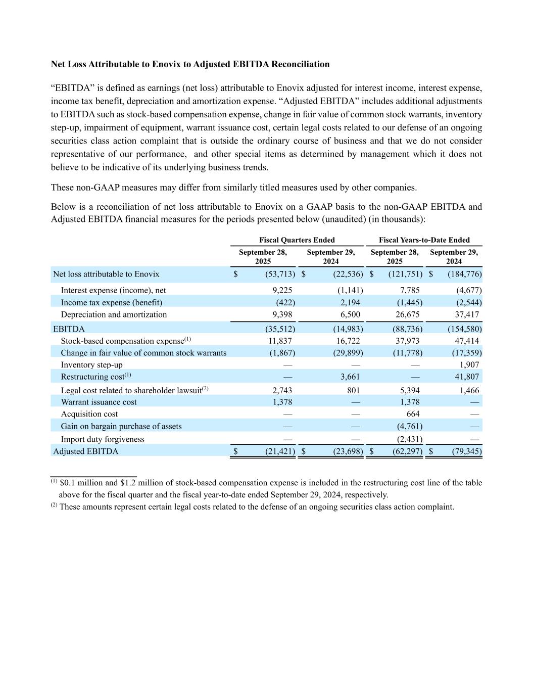 Net Loss Attributable to Enovix to Adjusted EBITDA Reconciliation “EBITDA” is defined as earnings (net loss) attributable to Enovix adjusted for interest income, interest expense, income tax benefit, depreciation and amortization expense. “Adjusted EBITDA” includes additional adjustments to EBITDA such as stock-based compensation expense, change in fair value of common stock warrants, inventory step-up, impairment of equipment, warrant issuance cost, certain legal costs related to our defense of an ongoing securities class action complaint that is outside the ordinary course of business and that we do not consider representative of our performance, and other special items as determined by management which it does not believe to be indicative of its underlying business trends. These non-GAAP measures may differ from similarly titled measures used by other companies. Below is a reconciliation of net loss attributable to Enovix on a GAAP basis to the non-GAAP EBITDA and Adjusted EBITDA financial measures for the periods presented below (unaudited) (in thousands): Fiscal Quarters Ended Fiscal Years-to-Date Ended September 28, 2025 September 29, 2024 September 28, 2025 September 29, 2024 Net loss attributable to Enovix $ (53,713) $ (22,536) $ (121,751) $ (184,776) Interest expense (income), net 9,225 (1,141) 7,785 (4,677) Income tax expense (benefit) (422) 2,194 (1,445) (2,544) Depreciation and amortization 9,398 6,500 26,675 37,417 EBITDA (35,512) (14,983) (88,736) (154,580) Stock-based compensation expense(1) 11,837 16,722 37,973 47,414 Change in fair value of common stock warrants (1,867) (29,899) (11,778) (17,359) Inventory step-up — — — 1,907 Restructuring cost(1) — 3,661 — 41,807 Legal cost related to shareholder lawsuit(2) 2,743 801 5,394 1,466 Warrant issuance cost 1,378 — 1,378 — Acquisition cost — — 664 — Gain on bargain purchase of assets — — (4,761) — Import duty forgiveness — — (2,431) — Adjusted EBITDA $ (21,421) $ (23,698) $ (62,297) $ (79,345) (1) $0.1 million and $1.2 million of stock-based compensation expense is included in the restructuring cost line of the table above for the fiscal quarter and the fiscal year-to-date ended September 29, 2024, respectively. (2) These amounts represent certain legal costs related to the defense of an ongoing securities class action complaint.
