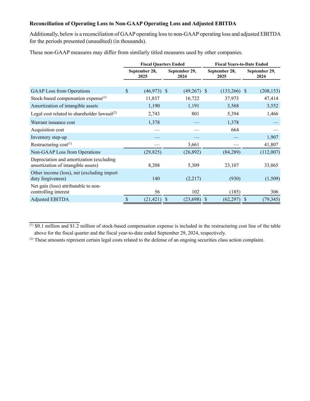 Reconciliation of Operating Loss to Non-GAAP Operating Loss and Adjusted EBITDA Additionally, below is a reconciliation of GAAP operating loss to non-GAAP operating loss and adjusted EBITDA for the periods presented (unaudited) (in thousands). These non-GAAP measures may differ from similarly titled measures used by other companies. Fiscal Quarters Ended Fiscal Years-to-Date Ended September 28, 2025 September 29, 2024 September 28, 2025 September 29, 2024 GAAP Loss from Operations $ (46,973) $ (49,267) $ (133,266) $ (208,153) Stock-based compensation expense(1) 11,837 16,722 37,973 47,414 Amortization of intangible assets 1,190 1,191 3,568 3,552 Legal cost related to shareholder lawsuit(2) 2,743 801 5,394 1,466 Warrant issuance cost 1,378 — 1,378 — Acquisition cost — — 664 — Inventory step-up — — — 1,907 Restructuring cost(1) — 3,661 — 41,807 Non-GAAP Loss from Operations (29,825) (26,892) (84,289) (112,007) Depreciation and amortization (excluding amortization of intangible assets) 8,208 5,309 23,107 33,865 Other income (loss), net (excluding import duty forgiveness) 140 (2,217) (930) (1,509) Net gain (loss) attributable to non- controlling interest 56 102 (185) 306 Adjusted EBITDA $ (21,421) $ (23,698) $ (62,297) $ (79,345) (1) $0.1 million and $1.2 million of stock-based compensation expense is included in the restructuring cost line of the table above for the fiscal quarter and the fiscal year-to-date ended September 29, 2024, respectively. (2) These amounts represent certain legal costs related to the defense of an ongoing securities class action complaint.