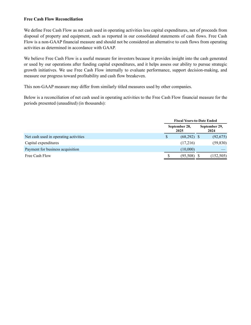 Free Cash Flow Reconciliation We define Free Cash Flow as net cash used in operating activities less capital expenditures, net of proceeds from disposal of property and equipment, each as reported in our consolidated statements of cash flows. Free Cash Flow is a non-GAAP financial measure and should not be considered an alternative to cash flows from operating activities as determined in accordance with GAAP. We believe Free Cash Flow is a useful measure for investors because it provides insight into the cash generated or used by our operations after funding capital expenditures, and it helps assess our ability to pursue strategic growth initiatives. We use Free Cash Flow internally to evaluate performance, support decision-making, and measure our progress toward profitability and cash flow breakeven. This non-GAAP measure may differ from similarly titled measures used by other companies. Below is a reconciliation of net cash used in operating activities to the Free Cash Flow financial measure for the periods presented (unaudited) (in thousands): Fiscal Years-to-Date Ended September 28, 2025 September 29, 2024 Net cash used in operating activities $ (68,292) $ (92,675) Capital expenditures (17,216) (59,830) Payment for business acquisition (10,000) — Free Cash Flow $ (95,508) $ (152,505)