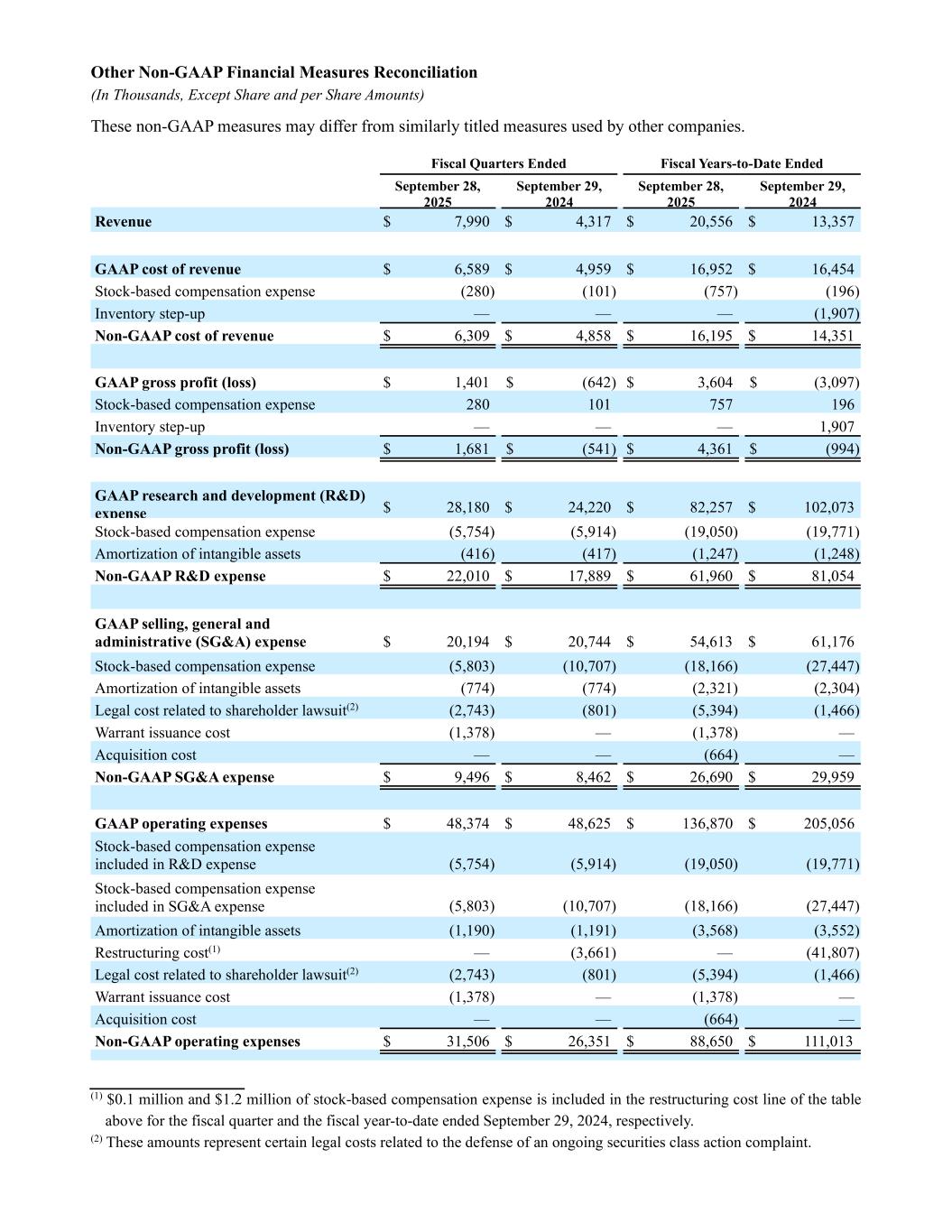Other Non-GAAP Financial Measures Reconciliation (In Thousands, Except Share and per Share Amounts) These non-GAAP measures may differ from similarly titled measures used by other companies. Fiscal Quarters Ended Fiscal Years-to-Date Ended September 28, 2025 September 29, 2024 September 28, 2025 September 29, 2024 Revenue $ 7,990 $ 4,317 $ 20,556 $ 13,357 GAAP cost of revenue $ 6,589 $ 4,959 $ 16,952 $ 16,454 Stock-based compensation expense (280) (101) (757) (196) Inventory step-up — — — (1,907) Non-GAAP cost of revenue $ 6,309 $ 4,858 $ 16,195 $ 14,351 GAAP gross profit (loss) $ 1,401 $ (642) $ 3,604 $ (3,097) Stock-based compensation expense 280 101 757 196 Inventory step-up — — — 1,907 Non-GAAP gross profit (loss) $ 1,681 $ (541) $ 4,361 $ (994) GAAP research and development (R&D) expense $ 28,180 $ 24,220 $ 82,257 $ 102,073 Stock-based compensation expense (5,754) (5,914) (19,050) (19,771) Amortization of intangible assets (416) (417) (1,247) (1,248) Non-GAAP R&D expense $ 22,010 $ 17,889 $ 61,960 $ 81,054 GAAP selling, general and administrative (SG&A) expense $ 20,194 $ 20,744 $ 54,613 $ 61,176 Stock-based compensation expense (5,803) (10,707) (18,166) (27,447) Amortization of intangible assets (774) (774) (2,321) (2,304) Legal cost related to shareholder lawsuit(2) (2,743) (801) (5,394) (1,466) Warrant issuance cost (1,378) — (1,378) — Acquisition cost — — (664) — Non-GAAP SG&A expense $ 9,496 $ 8,462 $ 26,690 $ 29,959 GAAP operating expenses $ 48,374 $ 48,625 $ 136,870 $ 205,056 Stock-based compensation expense included in R&D expense (5,754) (5,914) (19,050) (19,771) Stock-based compensation expense included in SG&A expense (5,803) (10,707) (18,166) (27,447) Amortization of intangible assets (1,190) (1,191) (3,568) (3,552) Restructuring cost(1) — (3,661) — (41,807) Legal cost related to shareholder lawsuit(2) (2,743) (801) (5,394) (1,466) Warrant issuance cost (1,378) — (1,378) — Acquisition cost — — (664) — Non-GAAP operating expenses $ 31,506 $ 26,351 $ 88,650 $ 111,013 (1) $0.1 million and $1.2 million of stock-based compensation expense is included in the restructuring cost line of the table above for the fiscal quarter and the fiscal year-to-date ended September 29, 2024, respectively. (2) These amounts represent certain legal costs related to the defense of an ongoing securities class action complaint.