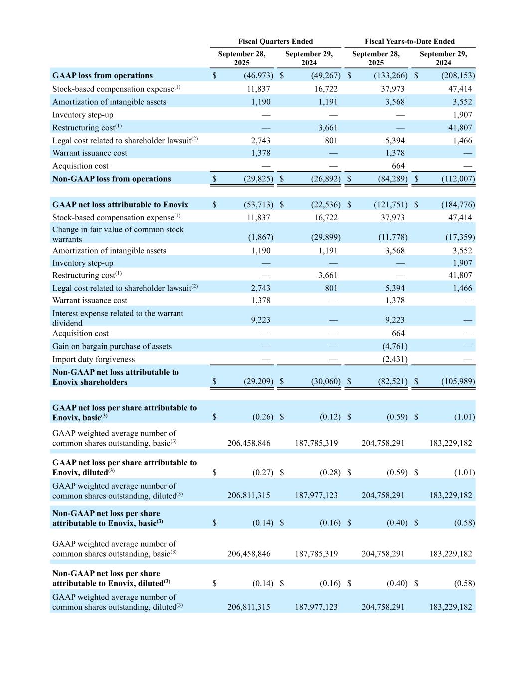 Fiscal Quarters Ended Fiscal Years-to-Date Ended September 28, 2025 September 29, 2024 September 28, 2025 September 29, 2024 GAAP loss from operations $ (46,973) $ (49,267) $ (133,266) $ (208,153) Stock-based compensation expense(1) 11,837 16,722 37,973 47,414 Amortization of intangible assets 1,190 1,191 3,568 3,552 Inventory step-up — — — 1,907 Restructuring cost(1) — 3,661 — 41,807 Legal cost related to shareholder lawsuit(2) 2,743 801 5,394 1,466 Warrant issuance cost 1,378 — 1,378 — Acquisition cost — — 664 — Non-GAAP loss from operations $ (29,825) $ (26,892) $ (84,289) $ (112,007) GAAP net loss attributable to Enovix $ (53,713) $ (22,536) $ (121,751) $ (184,776) Stock-based compensation expense(1) 11,837 16,722 37,973 47,414 Change in fair value of common stock warrants (1,867) (29,899) (11,778) (17,359) Amortization of intangible assets 1,190 1,191 3,568 3,552 Inventory step-up — — — 1,907 Restructuring cost(1) — 3,661 — 41,807 Legal cost related to shareholder lawsuit(2) 2,743 801 5,394 1,466 Warrant issuance cost 1,378 — 1,378 — Interest expense related to the warrant dividend 9,223 — 9,223 — Acquisition cost — — 664 — Gain on bargain purchase of assets — — (4,761) — Import duty forgiveness — — (2,431) — Non-GAAP net loss attributable to Enovix shareholders $ (29,209) $ (30,060) $ (82,521) $ (105,989) GAAP net loss per share attributable to Enovix, basic(3) $ (0.26) $ (0.12) $ (0.59) $ (1.01) GAAP weighted average number of common shares outstanding, basic(3) 206,458,846 187,785,319 204,758,291 183,229,182 GAAP net loss per share attributable to Enovix, diluted(3) $ (0.27) $ (0.28) $ (0.59) $ (1.01) GAAP weighted average number of common shares outstanding, diluted(3) 206,811,315 187,977,123 204,758,291 183,229,182 Non-GAAP net loss per share attributable to Enovix, basic(3) $ (0.14) $ (0.16) $ (0.40) $ (0.58) GAAP weighted average number of common shares outstanding, basic(3) 206,458,846 187,785,319 204,758,291 183,229,182 Non-GAAP net loss per share attributable to Enovix, diluted(3) $ (0.14) $ (0.16) $ (0.40) $ (0.58) GAAP weighted average number of common shares outstanding, diluted(3) 206,811,315 187,977,123 204,758,291 183,229,182