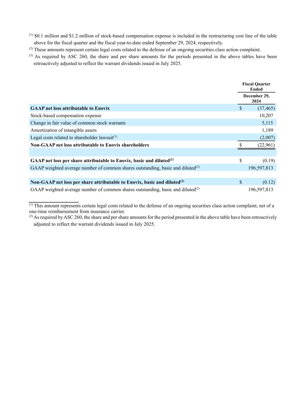 (1) $0.1 million and $1.2 million of stock-based compensation expense is included in the restructuring cost line of the table above for the fiscal quarter and the fiscal year-to-date ended September 29, 2024, respectively. (2) These amounts represent certain legal costs related to the defense of an ongoing securities class action complaint. (3) As required by ASC 260, the share and per share amounts for the periods presented in the above tables have been retroactively adjusted to reflect the warrant dividends issued in July 2025. Fiscal Quarter Ended December 29, 2024 GAAP net loss attributable to Enovix $ (37,465) Stock-based compensation expense 10,207 Change in fair value of common stock warrants 5,115 Amortization of intangible assets 1,189 Legal costs related to shareholder lawsuit(1) (2,007) Non-GAAP net loss attributable to Enovix shareholders $ (22,961) GAAP net loss per share attributable to Enovix, basic and diluted(2) $ (0.19) GAAP weighted average number of common shares outstanding, basic and diluted(2) 196,597,813 Non-GAAP net loss per share attributable to Enovix, basic and diluted(2) $ (0.12) GAAP weighted average number of common shares outstanding, basic and diluted(2) 196,597,813 (1) This amount represents certain legal costs related to the defense of an ongoing securities class action complaint, net of a one-time reimbursement from insurance carrier. (2) As required by ASC 260, the share and per share amounts for the period presented in the above table have been retroactively adjusted to reflect the warrant dividends issued in July 2025.