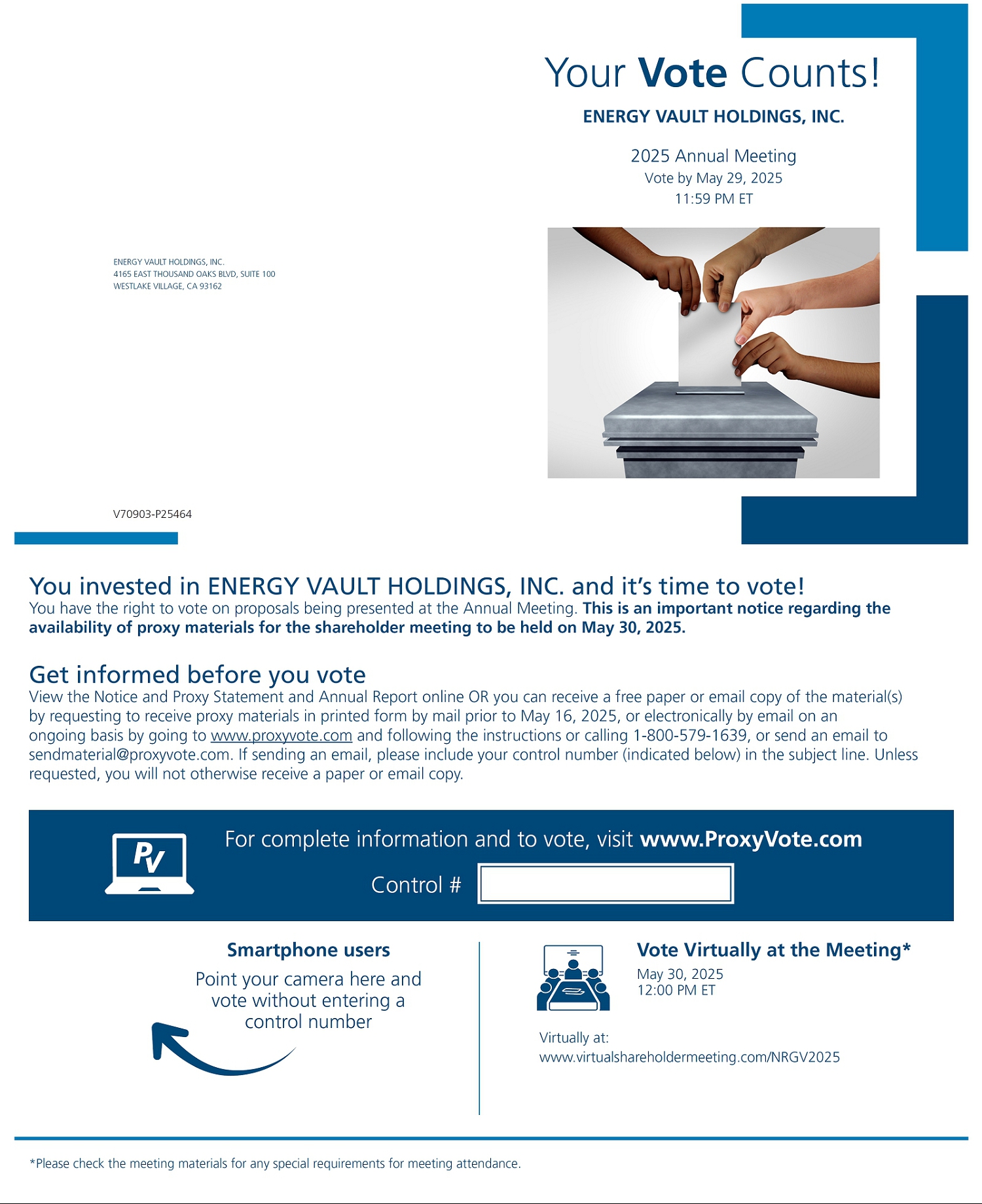 Your Vote Counts! *Please check the meeting materials for any special requirements for meeting attendance. Smartphone users Point your camera here and vote without entering a control number For complete information and to vote, visit www.ProxyVote.com Control # V70903-P25464 ENERGY VAULT HOLDINGS, INC. 4165 EAST THOUSAND OAKS BLVD, SUITE 100 WESTLAKE VILLAGE, CA 93162 ENERGY VAULT HOLDINGS, INC. 2025 Annual Meeting Vote by May 29, 2025 11:59 PM ET You invested in ENERGY VAULT HOLDINGS, INC. and it’s time to vote! You have the right to vote on proposals being presented at the Annual Meeting. This is an important notice regarding the availability of proxy materials for the shareholder meeting to be held on May 30, 2025. Vote Virtually at the Meeting* May 30, 2025 12:00 PM ET Virtually at: www.virtualshareholdermeeting.com/NRGV2025 Get informed before you vote View the Notice and Proxy Statement and Annual Report online OR you can receive a free paper or email copy of the material(s) by requesting to receive proxy materials in printed form by mail prior to May 16, 2025, or electronically by email on an ongoing basis by going to www.proxyvote.com and following the instructions or calling 1-800-579-1639, or send an email to sendmaterial@proxyvote.com. If sending an email, please include your control number (indicated below) in the subject line. Unless requested, you will not otherwise receive a paper or email copy. |