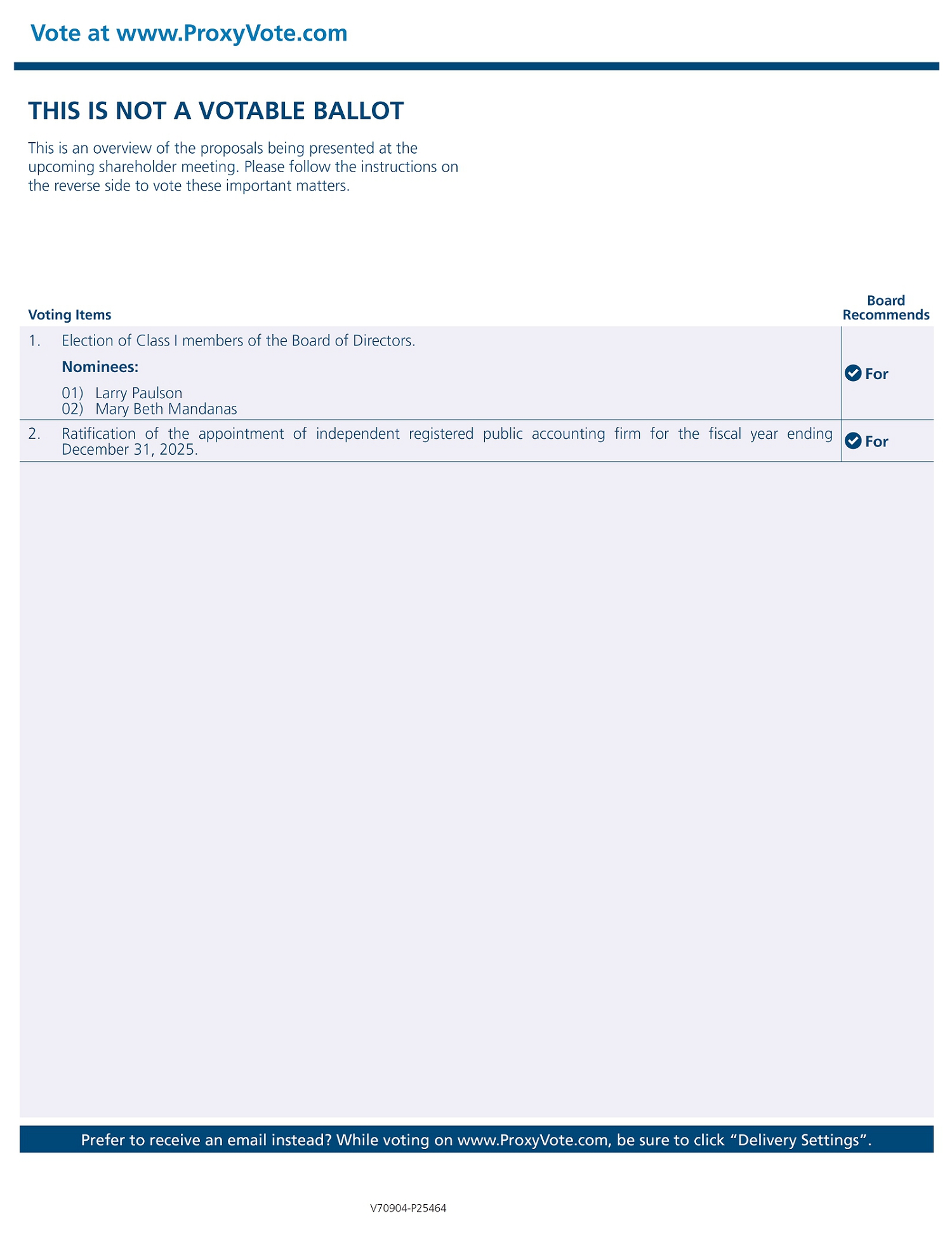 ![]() | Vote at www.ProxyVote.com Prefer to receive an email instead? While voting on www.ProxyVote.com, be sure to click “Delivery Settings”. Voting Items Board Recommends V70904-P25464 THIS IS NOT A VOTABLE BALLOT This is an overview of the proposals being presented at the upcoming shareholder meeting. Please follow the instructions on the reverse side to vote these important matters. 1. Election of Class I members of the Board of Directors. For Nominees: 01) Larry Paulson 02) Mary Beth Mandanas 2. Ratification of the appointment of independent registered public accounting firm for the fiscal year ending December 31, 2025. For |