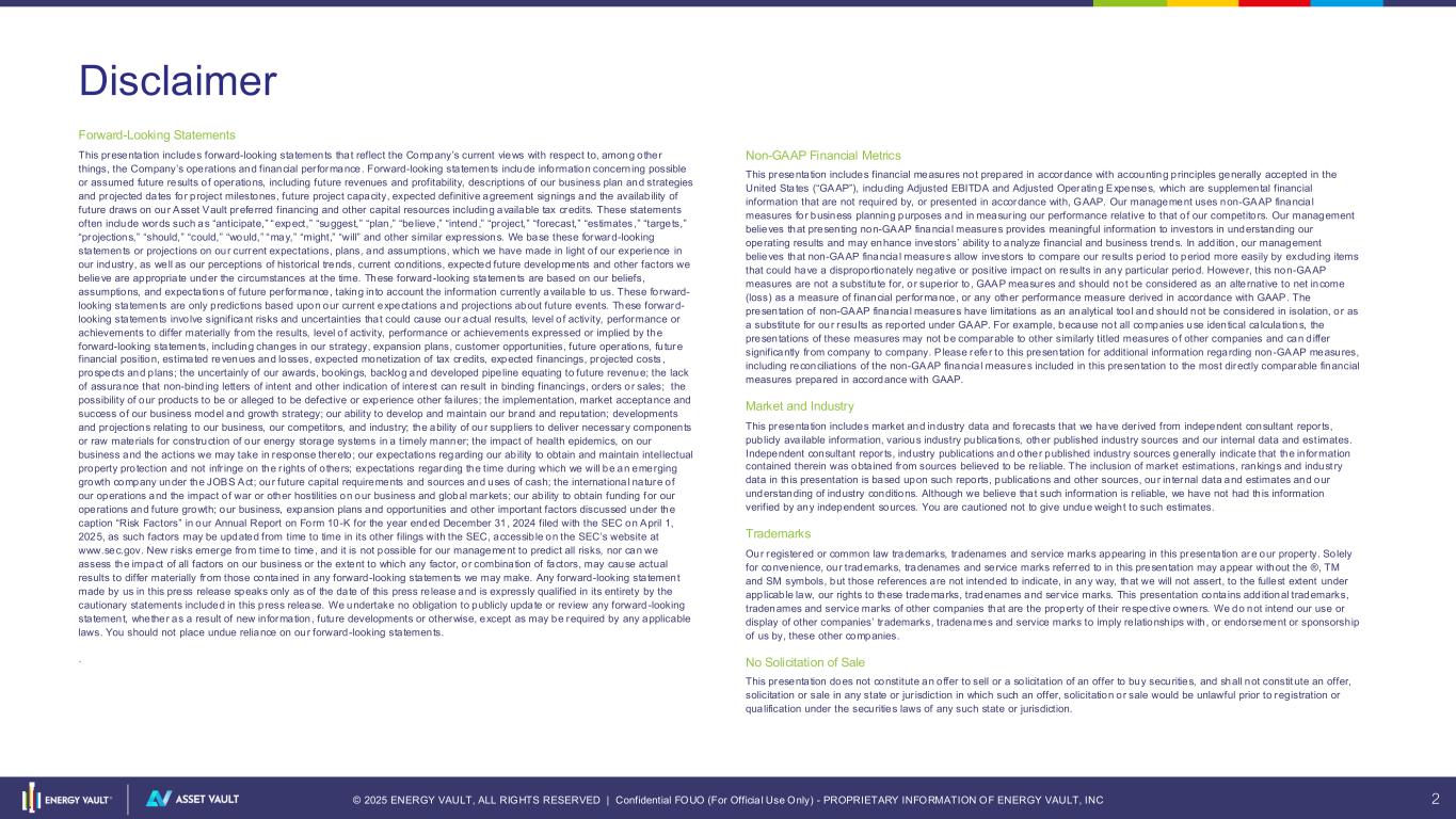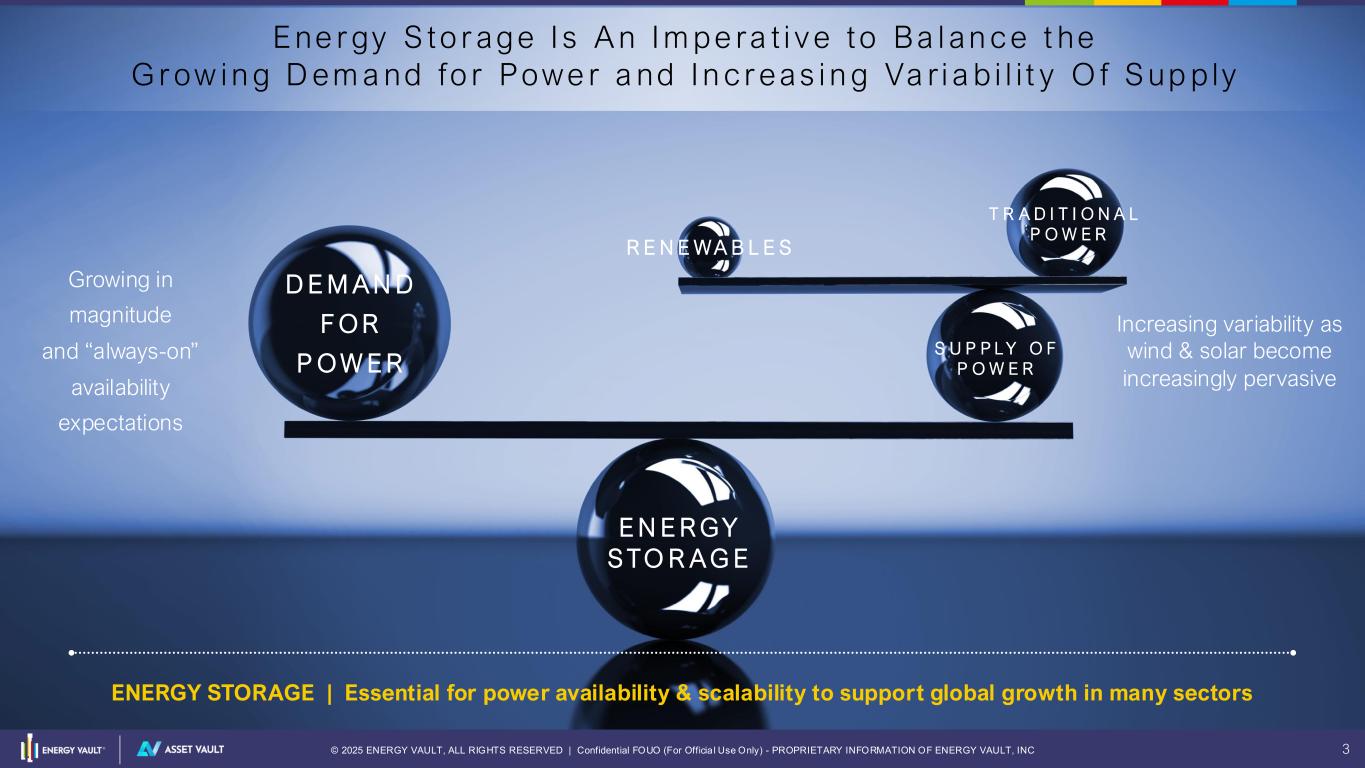 © 2025 ENERGY VAULT, ALL RIGHTS RESERVED | Confidential FOUO (For Officia l Use Only) - PROPRIETARY INFORMATION OF ENERGY VAULT, INC 2 Disclaimer Forward-Looking Statements This presentation includes forward-looking statements that reflect the Company’s current views with respect to, among other things, the Company’s operations and financial per formance. Forward-looking statements include information concern ing possible or assumed future results of operations, including future revenues and profitability, descriptions of our business plan and strategies and projected dates for project milestones, future project capacity, expected definitive agreement signings and the availab ility of future draws on our Asset Vault preferred financing and other capital resources including available tax credits. These statements often include words such as “anticipate,” “expect,” “suggest,” “plan,” “be lieve,” “intend,” “project,” “forecast,” “estimates ,” “targets,” “projections,” “should,” “could,” “would,” “may,” “might,” “will” and other similar expressions. We base these forward-looking statements or projections on our current expectations, plans, and assumptions, which we have made in light o f our experience in our industry, as well as our perceptions of historical trends, current conditions, expected future developments and other factors we believe are appropria te under the circumstances at the time. These forward-looking statements are based on our beliefs, assumptions, and expectations of future per formance, taking in to account the information currently available to us. These forward- looking statements are only predictions based upon our current expectations and projections about future events. These forward- looking statements involve significant risks and uncertainties that could cause our actual results, level of activity, performance or achievements to differ materially from the results, level o f activity, performance or achievements expressed or implied by the forward-looking statements, including changes in our strategy, expansion plans, customer opportunities, future operations, fu ture financial position, estimated revenues and losses, expected monetization of tax credits, expected financings, projected costs , prospects and p lans; the uncertainly of our awards, bookings, backlog and developed pipeline equating to future revenue; the lack of assurance that non-bind ing letters of intent and other indication of interest can result in binding financings, orders or sales; the possibility of our products to be or alleged to be defective or experience other fa ilures; the implementation, market acceptance and success of our business model and growth strategy; our ability to develop and maintain our brand and reputation; developments and projections relating to our business, our competitors, and industry; the ability of our suppliers to deliver necessary components or raw materials for construction of our energy storage systems in a timely manner; the impact of health epidemics, on our business and the actions we may take in response thereto; our expectations regarding our ability to obtain and maintain intellectual property protection and not infr inge on the r ights of o thers; expectations regarding the time during which we will be an emerging growth company under the JOBS Act; our future capital requirements and sources and uses of cash; the international nature of our operations and the impact o f war or other hostilities on our business and global markets; our ab ility to obtain funding for our operations and future growth; our business, expansion plans and opportunities and other important factors discussed under the caption “Risk Factors” in our Annual Report on Form 10-K for the year ended December 31, 2024 filed with the SEC on April 1, 2025, as such factors may be updated from time to time in its other filings with the SEC, accessib le on the SEC’s website at www.sec.gov. New r isks emerge from time to time, and it is not possible for our management to predict all risks, nor can we assess the impact of all factors on our business or the extent to which any factor, or combination of factors, may cause actual results to differ materially from those conta ined in any forward-looking statements we may make. Any forward-looking statement made by us in this press release speaks only as of the date of this press re lease and is expressly qualified in its entirety by the cautionary statements included in this press release. We undertake no obligation to publicly update or review any forward -looking statement, whether as a result of new information, future developments or otherwise, except as may be required by any applicable laws. You should not place undue reliance on our forward-looking statements. . Non-GAAP Financial Metrics This presentation includes financial measures not prepared in accordance with accounting principles generally accepted in the United States (“GAAP”), including Adjusted EBITDA and Adjusted Operating Expenses, which are supplemental financial information that are not required by, or presented in accordance with, GAAP. Our management uses non-GAAP financia l measures for business planning purposes and in measur ing our performance relative to that o f our competitors. Our management believes that presenting non-GAAP financia l measures provides meaningful information to investors in understanding our operating results and may enhance investors’ ability to analyze financial and business trends. In addition, our management believes that non-GAAP financia l measures allow investors to compare our results period to period more easily by exclud ing items that could have a disproportionately negative or positive impact on results in any particular period. However, this non-GAAP measures are not a substitu te for, or superior to , GAAP measures and should not be considered as an alte