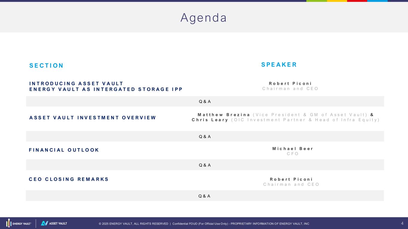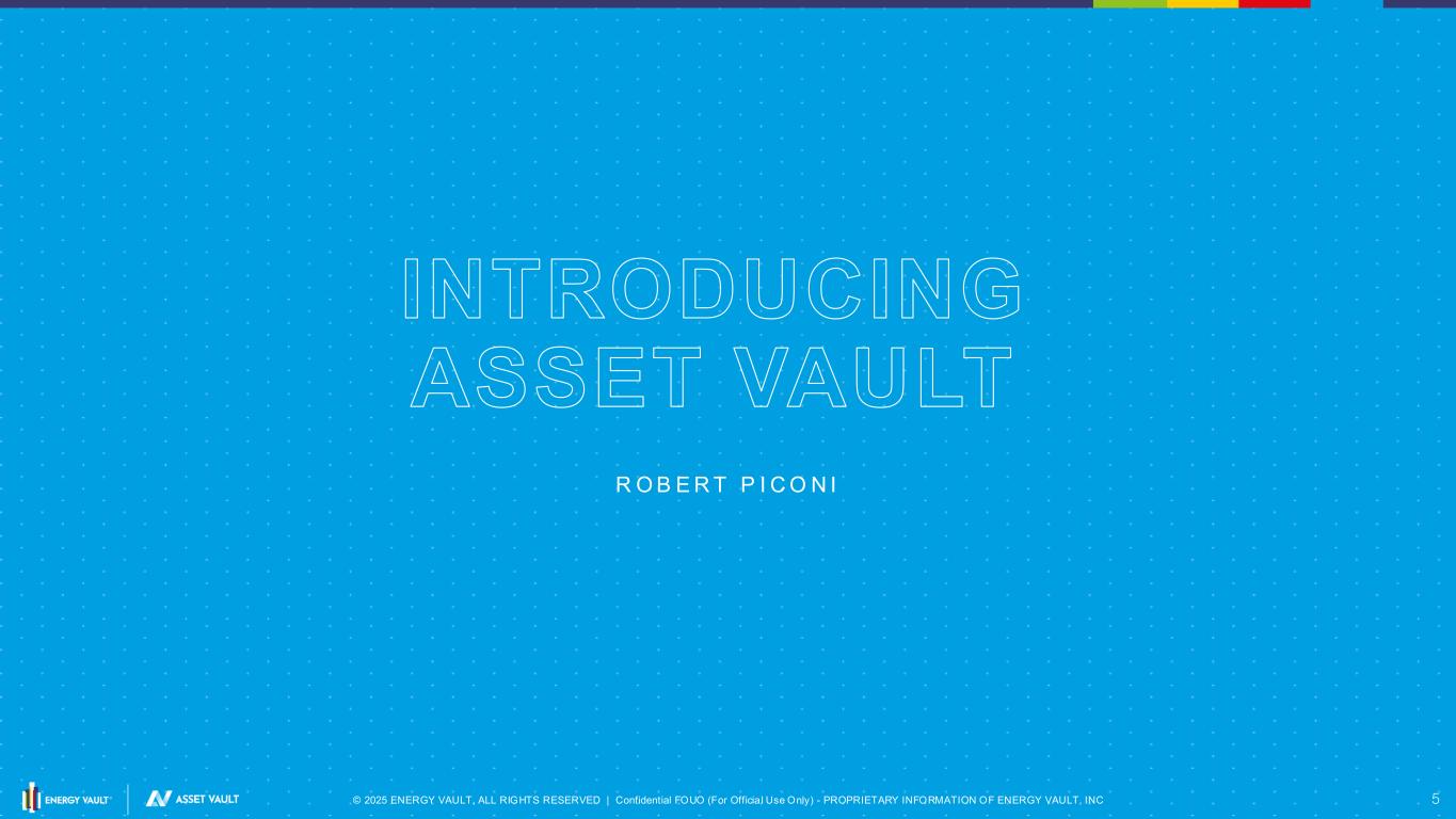 © 2025 ENERGY VAULT, ALL RIGHTS RESERVED | Confidential FOUO (For Officia l Use Only) - PROPRIETARY INFORMATION OF ENERGY VAULT, INC 4 Agenda S E C T I O N S P E A K E R Q & A I N T R O D U C I N G A S S E T V A U L T E N E R G Y V A U L T A S I N T E R G A T E D S T O R A G E I P P R o b e r t P i c o n i C h a i r m a n a n d C E O A S S E T V A U L T I N V E S T M E N T O V E R V I E W M a t t h e w B r e z i n a ( V i c e P r e s i d e n t & G M o f A s s e t V a u l t ) & C h r i s L e a r y ( O I C I n v e s t m e n t P a r t n e r & H e a d o f I n f r a E q u i t y ) F I N A N C I A L O U T L O O K M i c h a e l B e e r C F O C E O C L O S I N G R E M A R K S R o b e r t P i c o n i C h a i r m a n a n d C E O Q & A Q & A Q & A
