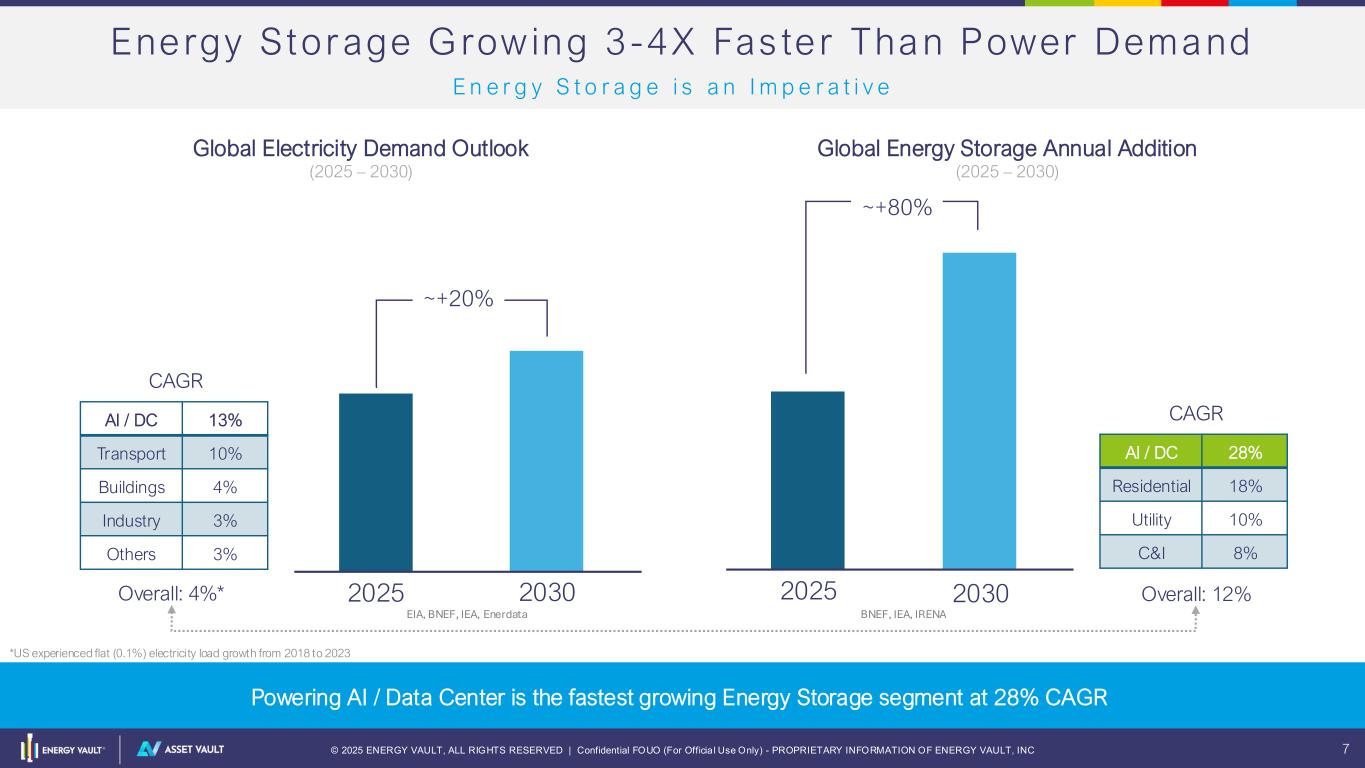 © 2025 ENERGY VAULT, ALL RIGHTS RESERVED | Confidential FOUO (For Officia l Use Only) - PROPRIETARY INFORMATION OF ENERGY VAULT, INC 6 Energy Vau l t as In teg rated Storage IPP wi th A sset Vau lt Executing our Plan: building and operating critical energy infrastructure • First 65MW online in California and Texas, closed project financings • In construction: 125 MW Stoney Creek in Australia, 150 MW Sosa Energy System in Texas • First 340 MW will deliver ~$40M EBITDA run rate in next 24 months (exiting 2027) Closed $300M Preferred Equity Fund to enable 1.5 GW and $1+ billion in CapEx • Fund #1 to deliver $100-150 million in recurring annual EBITDA • Self Integration expertise adds additional cash flows to Energy Vault (~15% of CapEx) Contract backlog at ~$1 billion – accelerating with AI infrastructure build-out • Long Term off-take agreements de-risk project cash flows, add predictable high margin revenue • Asset ownership tied to AI Infrastructure build-out represents massive multiplier on $EBITDA / MW NRGV as Storage IPP uniquely positioned to capture AI Infrastructure Build-out