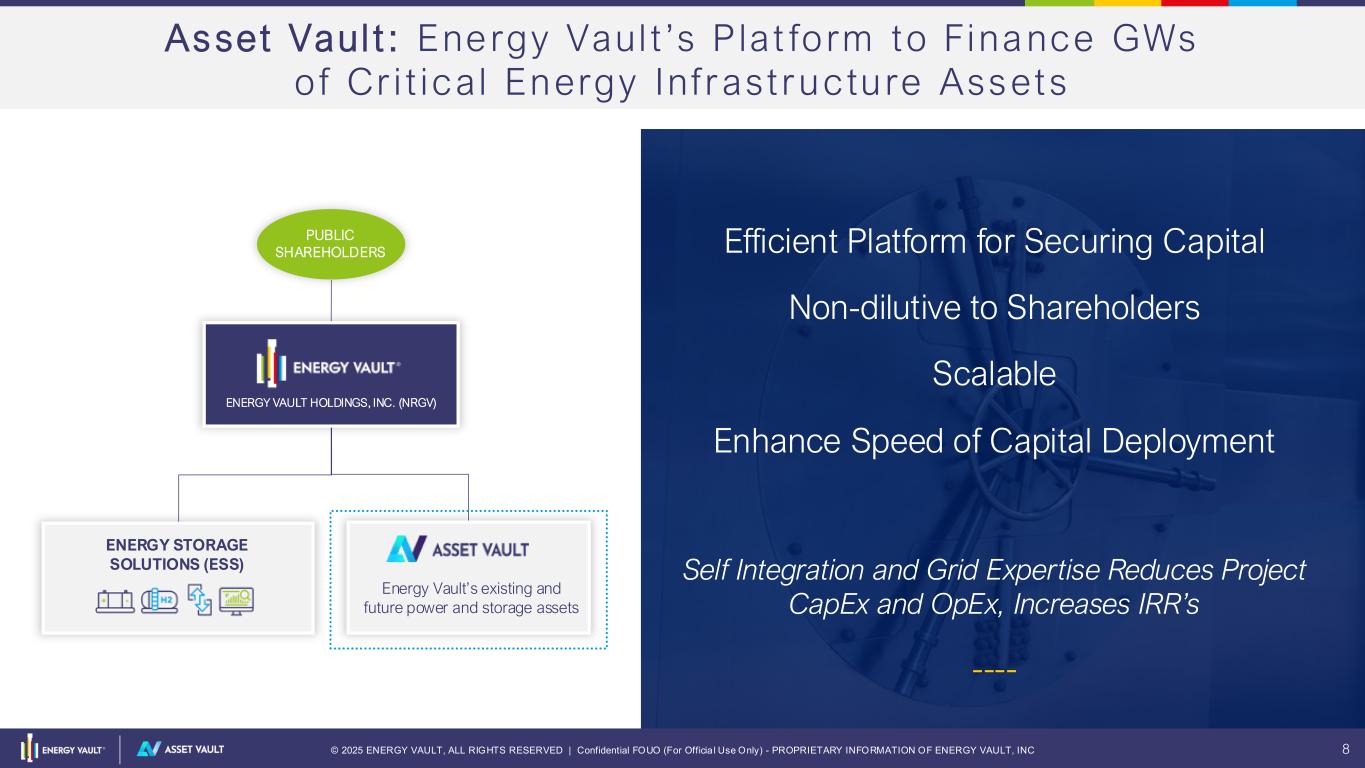 © 2025 ENERGY VAULT, ALL RIGHTS RESERVED | Confidential FOUO (For Officia l Use Only) - PROPRIETARY INFORMATION OF ENERGY VAULT, INC 7 Energy Storage G row ing 3 -4X Fas te r Than Power Demand 2025 2030 Global Electricity Demand Outlook (2025 – 2030) ~+20% AI / DC 13% Transport 10% Buildings 4% Industry 3% Others 3% Overall: 4%* CAGR 2025 2030 Global Energy Storage Annual Addition (2025 – 2030) ~+80% AI / DC 28% Residential 18% Utility 10% C&I 8% Overall: 12% CAGR BNEF, IEA, IRENAEIA, BNEF, IEA, Enerdata Powering AI / Data Center is the fastest growing Energy Storage segment at 28% CAGR E n e r g y S t o r a g e i s a n I m p e r a t i v e *US experienced flat (0.1%) electricity load growth from 2018 to 2023