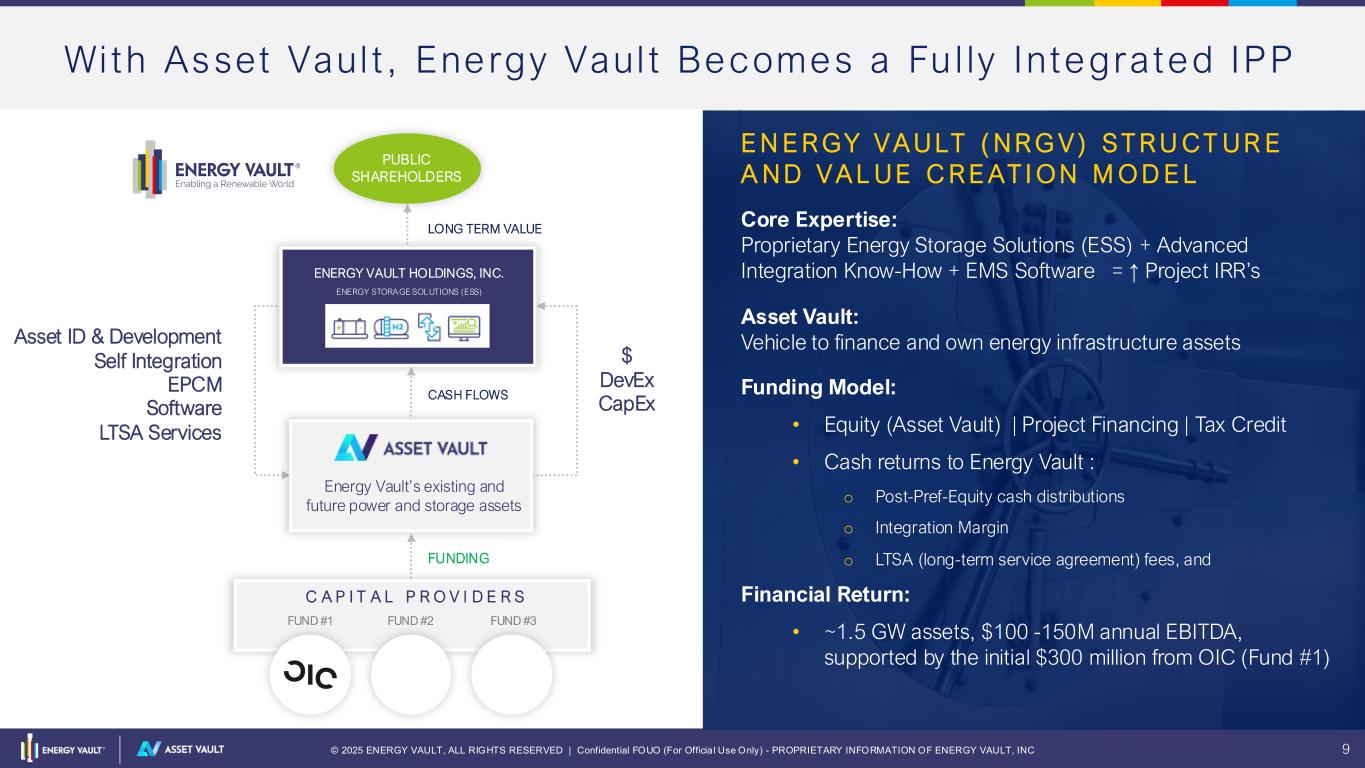 © 2025 ENERGY VAULT, ALL RIGHTS RESERVED | Confidential FOUO (For Officia l Use Only) - PROPRIETARY INFORMATION OF ENERGY VAULT, INC 8 Asset Vaul t : Energy Vaul t ’s P lat fo rm to Finance GWs of Cr i t ica l Energy Inf rast ructu re Assets Efficient Platform for Securing Capital Non-dilutive to Shareholders Scalable Enhance Speed of Capital Deployment Self Integration and Grid Expertise Reduces Project CapEx and OpEx, Increases IRR’s ---- PUBLIC SHAREHOLDERS ENERGY VAULT HOLDINGS, INC. (NRGV) Energy Vault’s existing and future power and storage assets ENERGY STORAGE SOLUTIONS (ESS)